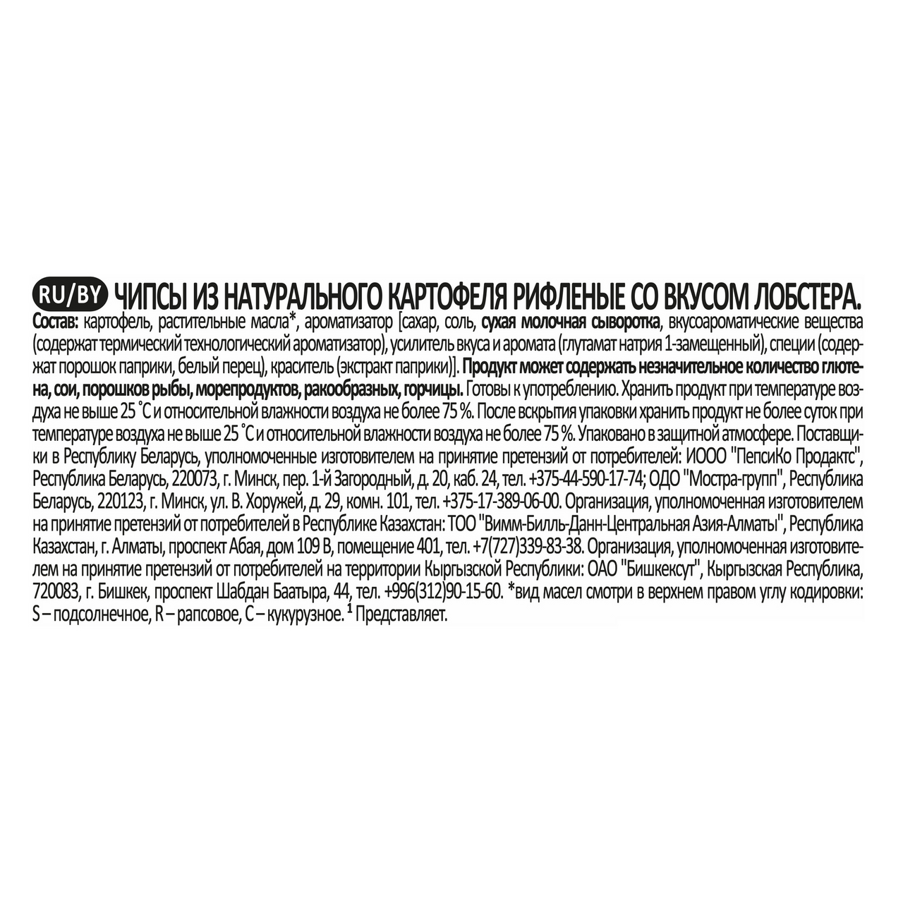 LAY'S— чипсы, каждая пачка которых изготовлена изспециально отобранного картофеля исоответствует самым высоким стандартам качества. Хрустящие илегкие навкус картофельные чипсы LAY'Sбыли созданы, чтобы вызвать улыбку налице каждого человека, поэтому ими так приятно делиться случшими друзьями. Чипсы LAY'S, несомненно, скрасят ваш день! ?Изысканный вкус омара инежно-рифленых, золотистых кусочков отборной картошки! Восхитительное сочетание оригинальной формы любимых чипсов LAY'Sипотрясающе нежного нового вкуса неоставит равнодушным даже самого искушенного гурмана.