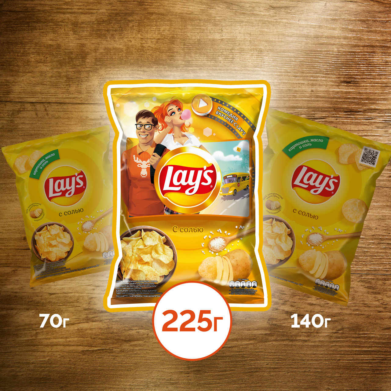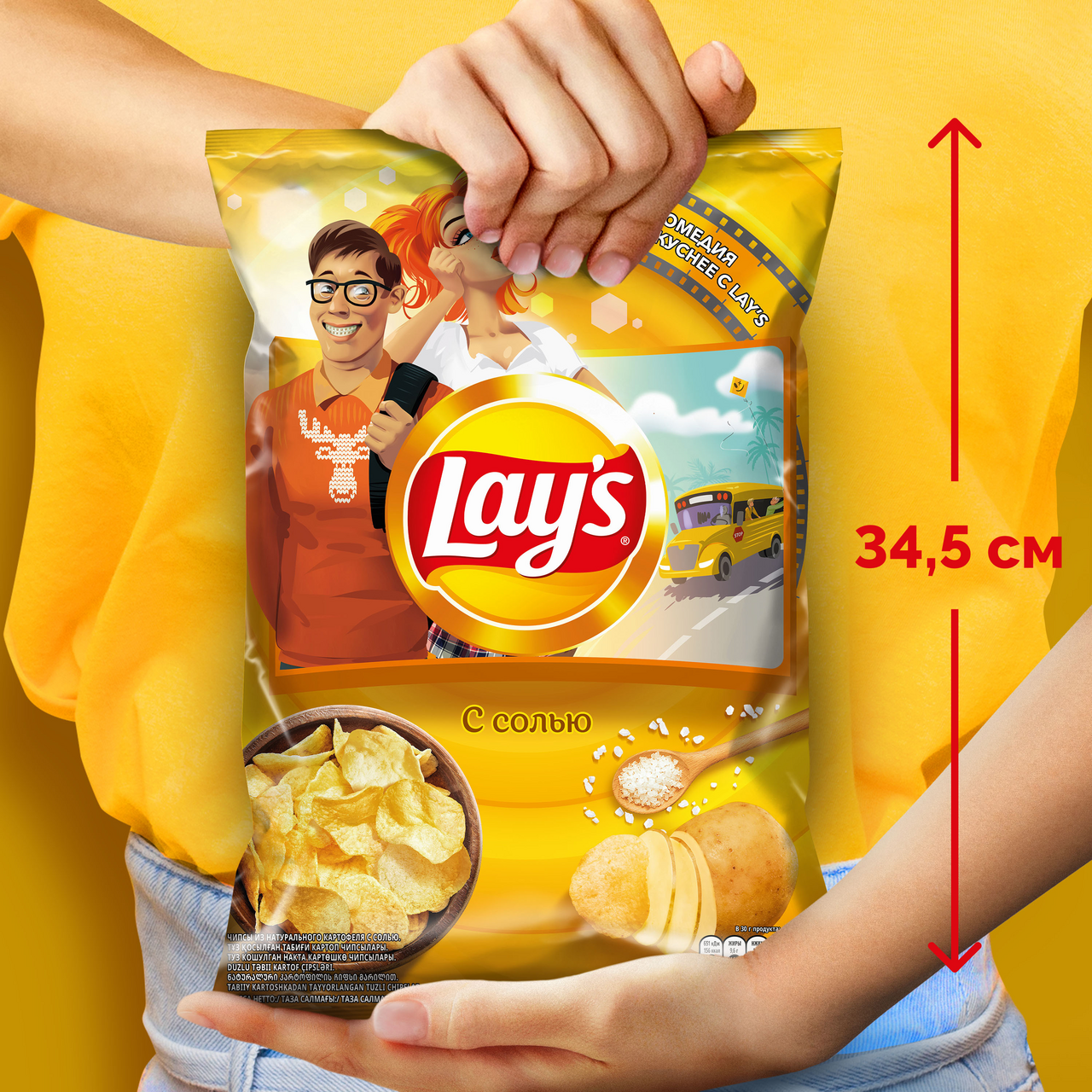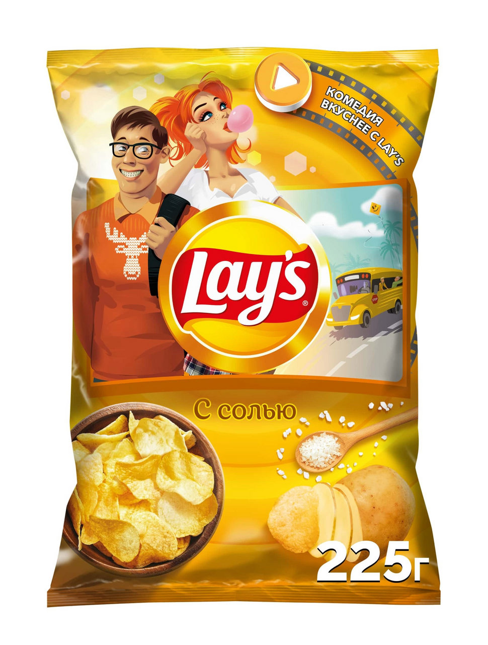 Сделаны из свежего отборного картофеля, обжаренного в растительном масле с солью. Всего 7 сортов из 2000 выращиваемых в мире попадают на заводы компании, где подвергаются бережной обработке на современном оборудовании (причем от мытья сырых клубней до запечатывания готового пакета проходит всего 40 минут). В каждой пачке чипсов Lays вас ждут тонкие, золотистые и аппетитно хрустящие ломтики с любимым вкусом. В этой - самые натуральные из всей линейки, просто подсоленные. К тому же их здесь очень много, так что хватит на всю семью. Открытую упаковку легко закрыть снова с помощью клейкой ленты.