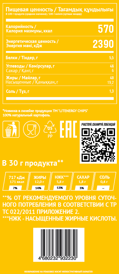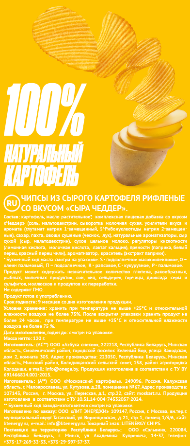 Картофельные чипсы Lit Energy со вкусом сыра Чеддер - идеальный выбор для тех, кто ценит насыщенные и яркие вкусовые ощущения. Эти хрустящие сырные чипсы из отборного картофеля обладают насыщенным сливочно-сырным вкусом с характерными пикантными нотами чеддера. Тонкие ломтики картофеля обжариваются до золотистой корочки, благодаря чему чипсы получаются ароматными, золотистыми и особенно хрустящими.