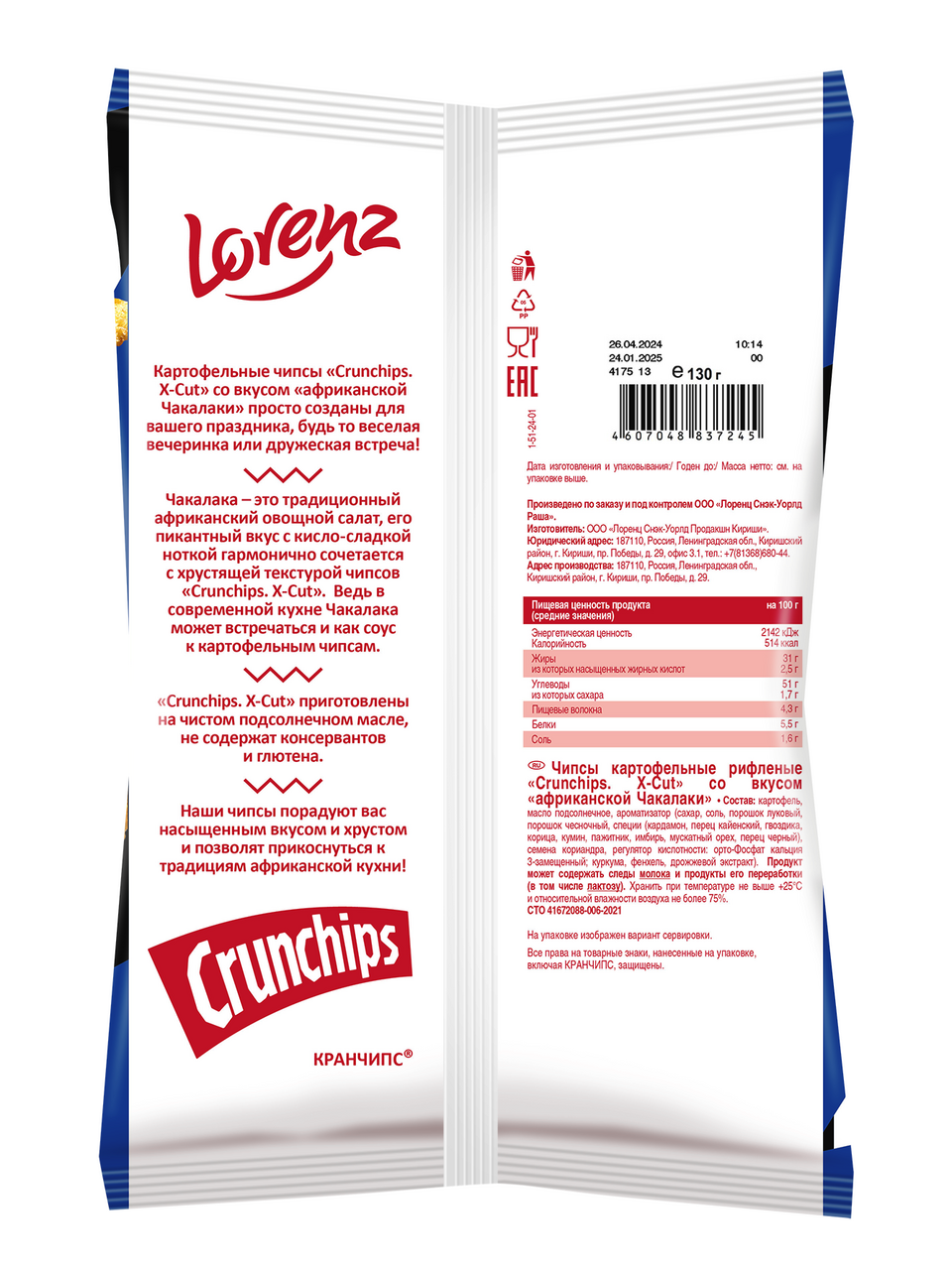 Чакалака - это традиционный африканский овощной салат, его пикантный вкус с кисло-сладкой ноткой гармонично сочетается с хрустящей текстурой чипсов Crunchips. X-Cut. Ведь в современной кухне Чакалака может встречаться и как соус к картофельным чипсам. Crunchips. X-Cut приготовлены на чистом подсолнечном масле, не содержат консервантов и глютена. Картофельные чипсы со вкусом африканской Чакалаки просто созданы для вашего праздника, будь то веселая вечеринка или дружеская встреча. Чипсы порадуют вас насыщенным вкусом и хрустом и позволят прикоснуться к традициям африканской кухни.