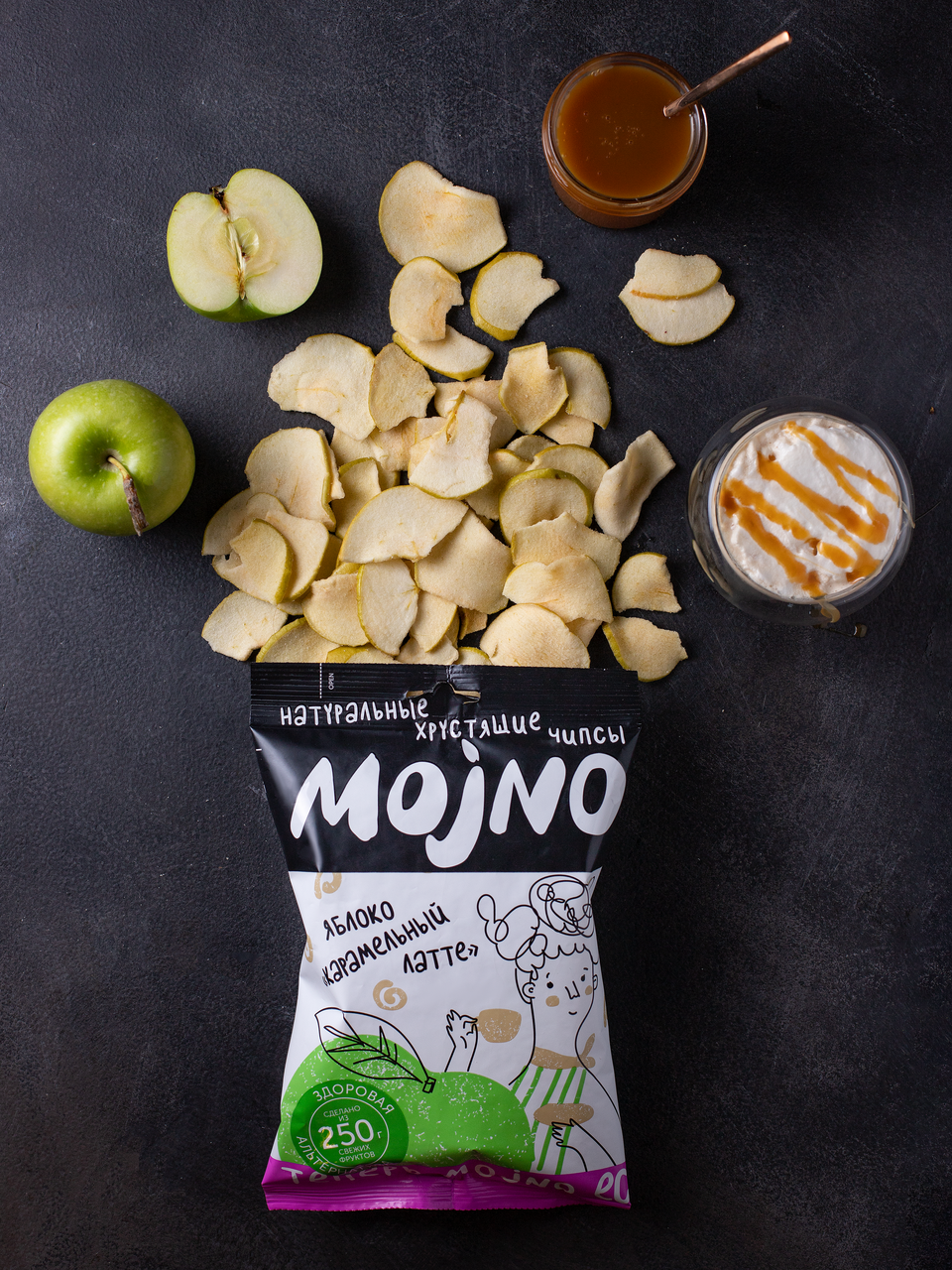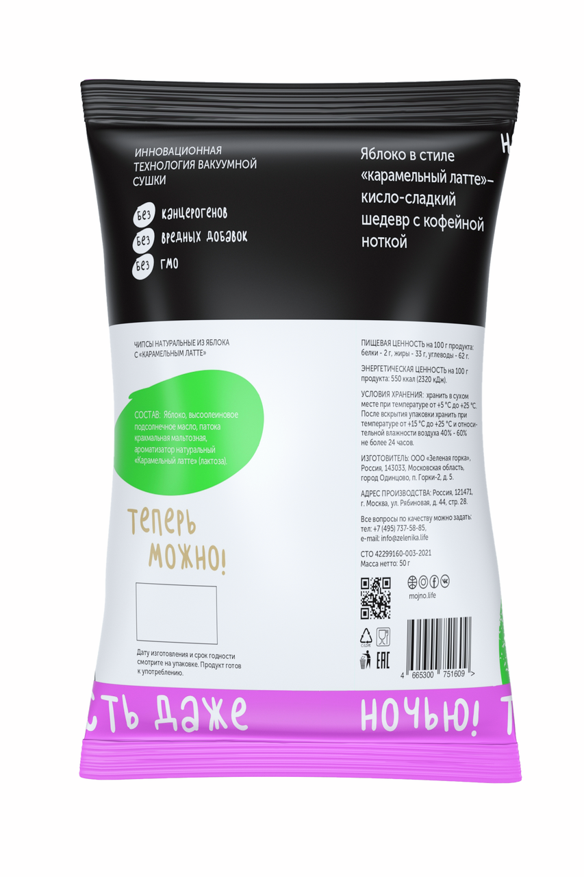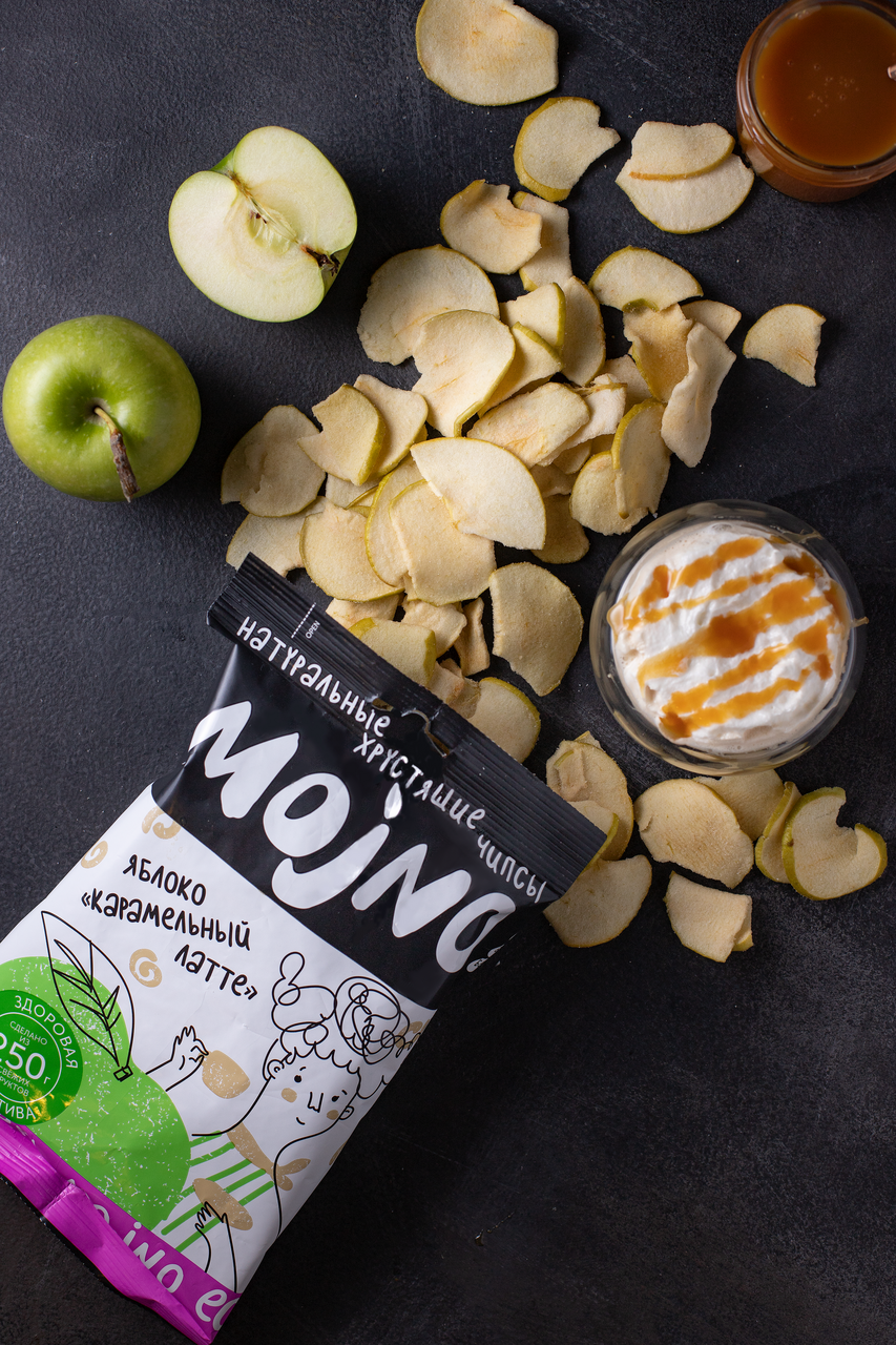Чипсы можно? Чипсы MOJNO! MOJNO - это не просто фруктовые чипсы. Натуральный вкус, чистый состав - вот наш секрет. Думаем десерт - говорим ЯБЛОКО И КАРАМЕЛЬНЫЙ ЛАТТЕ! Говорим яблоко и карамельный латте - думаем десерт. Нежный, кисло-сладкий, обволакивающий вкус яблока с кофейной ноткой: вот, что вас ждет в упаковке. Технология бережной вакуумной сушки с добавлением высокоолеинового масла позволяет создавать по-настоящему натуральные и безопасные снэки. В MOJNO нет вредных добавок, и мы не жарим наши чипсы в масле, поэтому в них нет никаких канцерогенов и трансжиров. Здоровая и вкусная альтернатива вредным перекусам. MOJNO - чипсы, которые МОЖНО дома и на работе, на прогулке и в гостях, утром и вечером - ведь теперь чипсы стали не только вкусными, но и натуральными! Идеально!