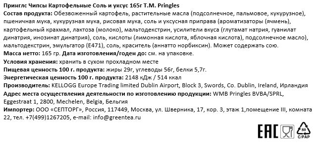 Каждый хрустящий золотистый чипсик искусно приправлен идеальным балансом соли и уксуса, обеспечивая аппетитный всплеск яркого вкуса в каждом кусочке. Если вам нужен сытный хруст к обеду или ароматный перекус на ходу, Pringles Salt and Vinegar поможет вам в этом. Окунитесь в банку этих идеально приправленных чипсов и ощутите неотразимое сочетание терпкого уксуса и пикантной соли.