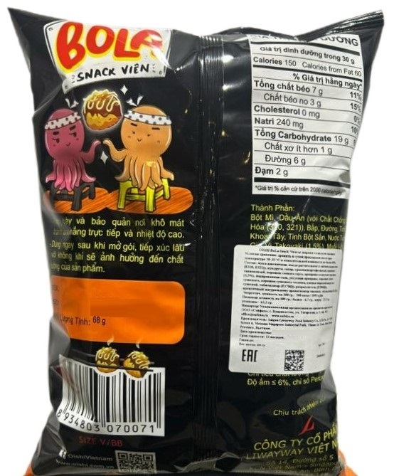 Необычные чипсы в форме хрустящих шариков с воздушной текстурой и вкусом популярной японской закуски такояки (пирожка с начинкой из щупалец осьминога, приготовленных в особом соусе). Ценители необычных азиатских снеков непременно должны попробовать эту интересную, ни на что не похожую закуску. Чипсы дополнительно приправлены луком, чесноком и хлопьями сушеной морской капусты. Сложный богатый вкус снека придется по вкусу гурманам и искателям новых вкусовых ощущений.