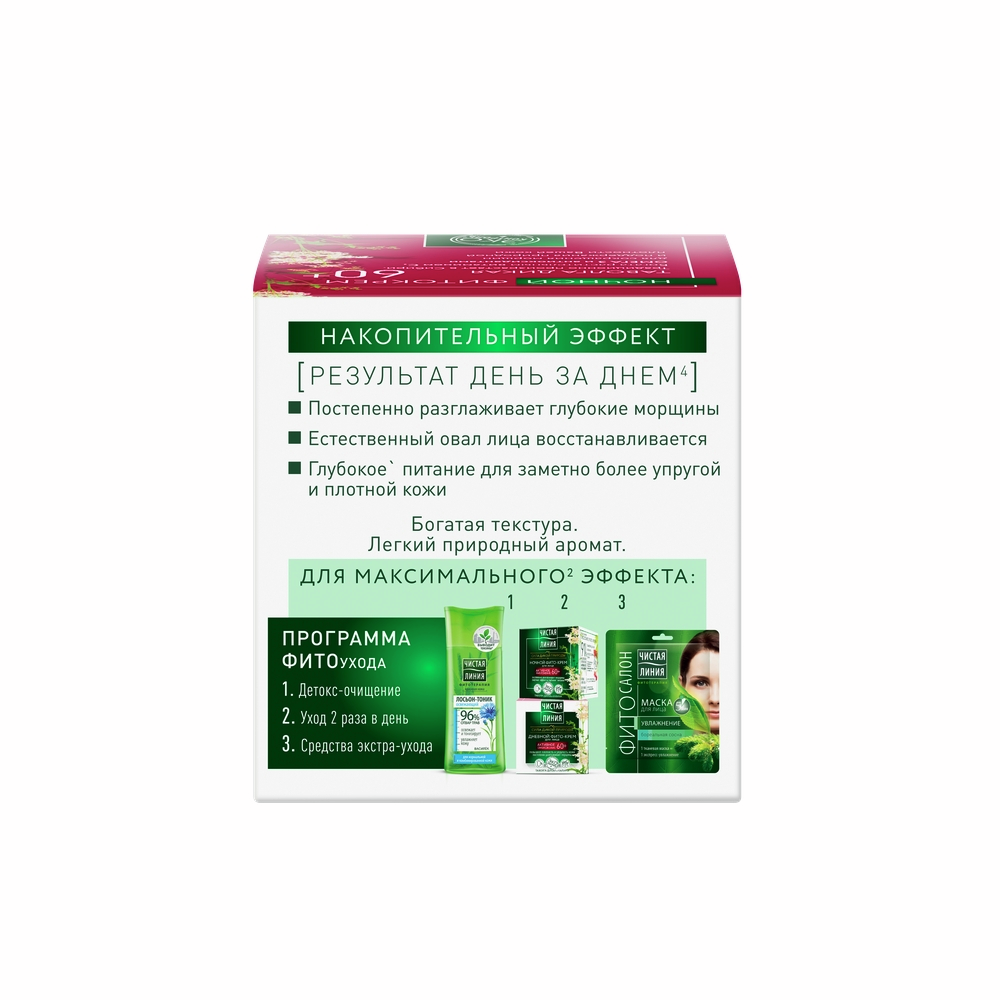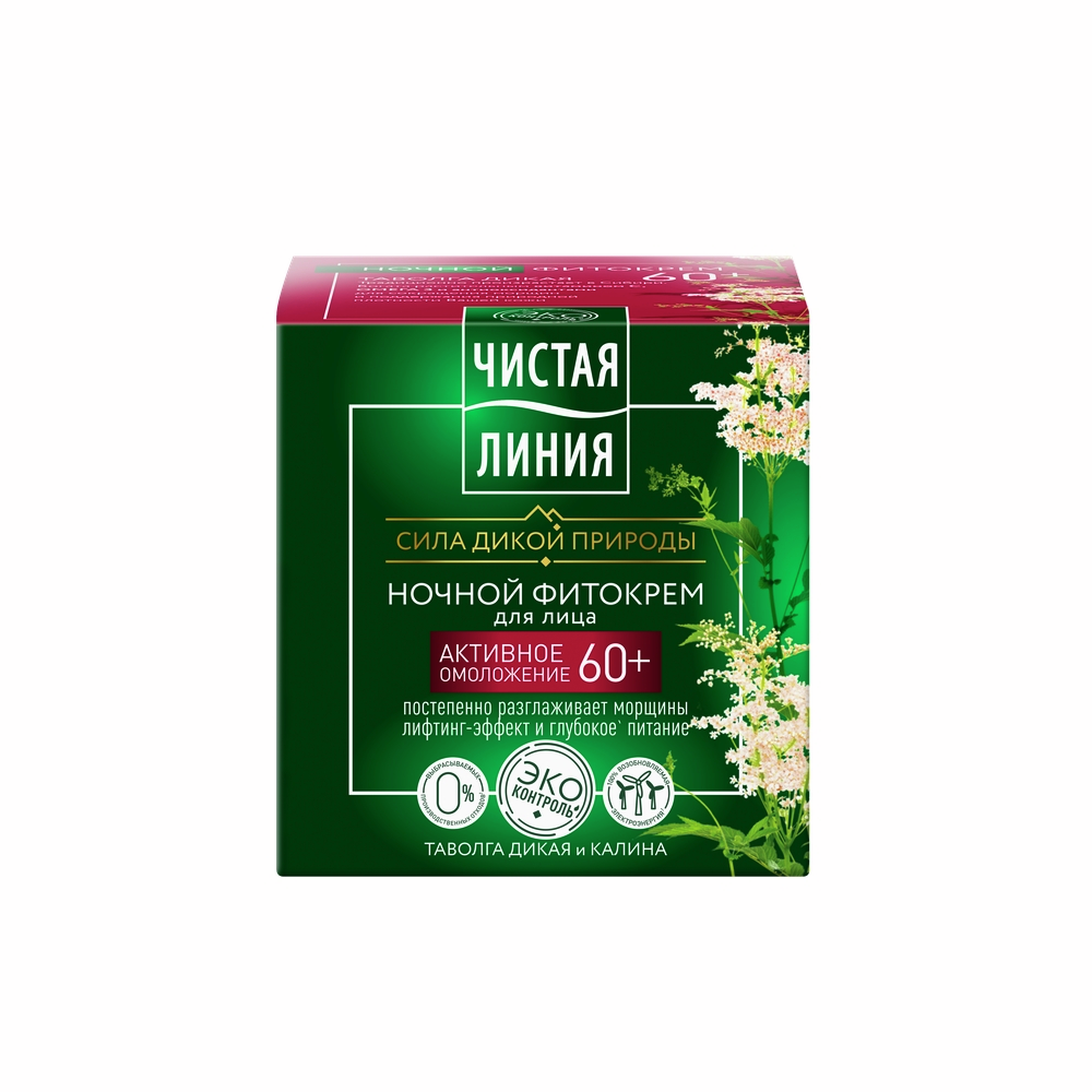 Зрелой коже нужен специальный уход, направленный на сохранение упругости и тонуса кожи. Именно поэтому эксперты лаборатории Чистая линия разработали специальную линейку фито-кремов от 60 лет, которая бережно заботится о зрелой коже, оказывает заметный лифтинг-эффект и освежает кожу.В состав линейки входят активные натуральные компоненты, созданные самой природой: вытяжка таволги, масло ягод калины и комплекс фитопротеинов.Кремы Чистая Линия обогащены комплексом фитоколлаген из ростков и семян пшеницы.Уже с первого применения проникая в кожу, комплекс фитоколлаген наполняет и разглаживает ее.Уже через 16 дней восстанавливает контуры лица.Ночной крем с фитокрллаген-комплексом Таволга и калина для зрелой кожи от 60 лет оказывает заметный лифтинг-эффект, способствует улучшению цвета кожи. Активные натуральные компоненты, входящие в состав крема, наполняют кожу свежестью и сиянием.Результат: мгновенно разглаживает и питает кожу, через 16 дней глубина морщин визуально уменьшается, заметный эффект лифтинга, более очерченные контуры лица, утром кожа выглядит свежей и отдохнувшей.Бренд Чистая Линия бережно относится к окружающей среде: мы ‘заряжаем’ продукты природной пользой для вас, при этом предпринимая меры по сохранению нашей общей зеленой планеты для будущих поколений. Мы закупаем 100% возобновляемую электроэнергию, полученную с использованием энергии ветра, для производства продукции на наших фабриках в Екатеринбурге �� Санкт-Петербурге, а также направляем 100% производственных отходов на утилизацию, отличную от передачи на полигон: на переработку или дальнейшее использование в других отраслях. Бренд Чистая Линия заботится о нашей природе.