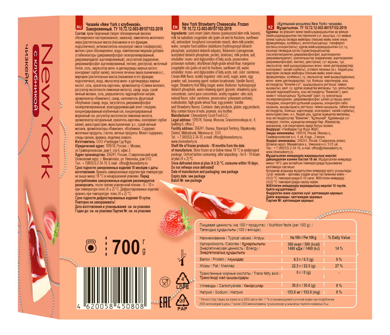 Крем творожный (творог обезжиренный, заменитель молочного жира (масла растительные (пальмовое, фракции пальмового масла, подсолнечное), эмульгаторы (моно- и диглицериды жирных кислот, лецитины), антиокислители (бутилгидроксианизол, бутилгидрокситолуол)), вода, молоко сухое обезжиренное, соль поваренная пищевая, эмульгатор моно- и диглицериды жирных кислот, комплексная пищевая добавка (стабилизатор каррагинан, загустители (дикрахмалфосфат ацетилированный, дикрахмаладипат ацетилированный)), консервант сорбат калия, стабилизаторы (каррагинан, камедь рожкового дерева, дикрахмаладипат ацетилированный)), песочное печенье (мука пшеничная в.с., маргарин (масла растительные (подсолнечное, пальмовое), вода, эмульгаторы (моно- и диглицериды жирных кислот, эфиры полиглицерина и жирных кислот), соль поваренная пищевая, ароматизатор Сливки-молоко, краситель каротины, регулятор кислотности лимонная кислота), сахар, сухой яичный меланж, ароматизатор Ванилин, разрыхлитель гидрокарбонат натрия, соль поваренная пищевая), сахар, крем на растительных маслах (вода, заменитель молочного жира (масла растительные (пальмовое, фракции пальмового масла, подсолнечное), эмульгаторы (моно-и диглицериды жирных кислот, лецитин), антиокислители (бутилгидроксианизон, бутилгидрокситолуол)), молоко сухое обезжиренное, стабилизаторы (дикрахмалфосфат оксипропиллированный, пектин), стабилизаторы (дикрахмаладипат ацетилированный, моно-и диглицериды жирных кислот, пектин), концентрат молочного белка, консервант сорбат калия), наполнитель фруктовый Клубника (сахар, вода, загуститель крахмал кукурузный, концентрированный сок клубники, агент влагоудерживающий глицерин, красители (концентрированный сок черной моркови, каротин), регулятор кислотности лимонная кислота, ароматизатор Клубника, консервант сорбат калия), маргарин (масла растительные (подсолнечное, пальмовое), вода, эмульгаторы (моно-и диглицериды жирных кислот, эфиры полиглицеридов и жирных кислот), соль поваренная пищевая, ароматизатор Сливки-молоко, краситель каротин, регулятор кислотности лимонная кислота), мука пшеничная в.с., сухой яичный меланж, комплексная пищевая добавка (стабилизатор каррагинан, ацетилированный дикрахмалфосфат), загустители (дикрахмалфосфат, дикрахмалдипат)), ароматизаторы (Ванилин, Клубника).
