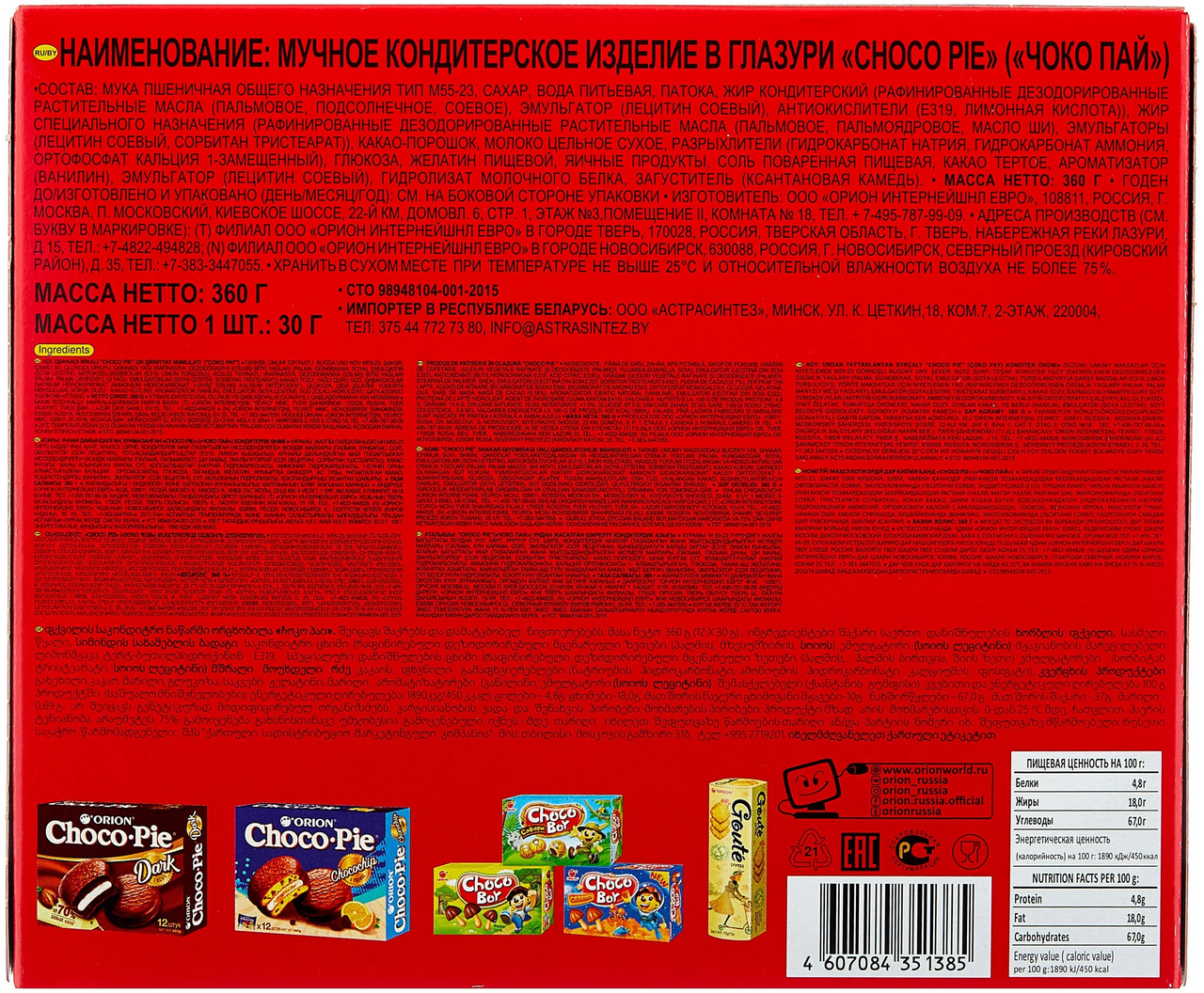 Это нежный бисквит с оригинальной зефирной начинкой маршмеллоу, покрытый плотным слоем шоколадной глазури. При его производстве не использовались консерванты, искусственные красители, глутамат натрия, трансгены, ГМО и трансжиры. НИИ питания РАМН включил пирожное Orion Choco Pie в список сбалансированных завтраков. Каждое изделие находится в индивидуальной упаковке, поэтому остается свежим и мягким длительное время. Его удобно брать с собой в дорогу или на работу, давать ребенку в школу или на прогулку.