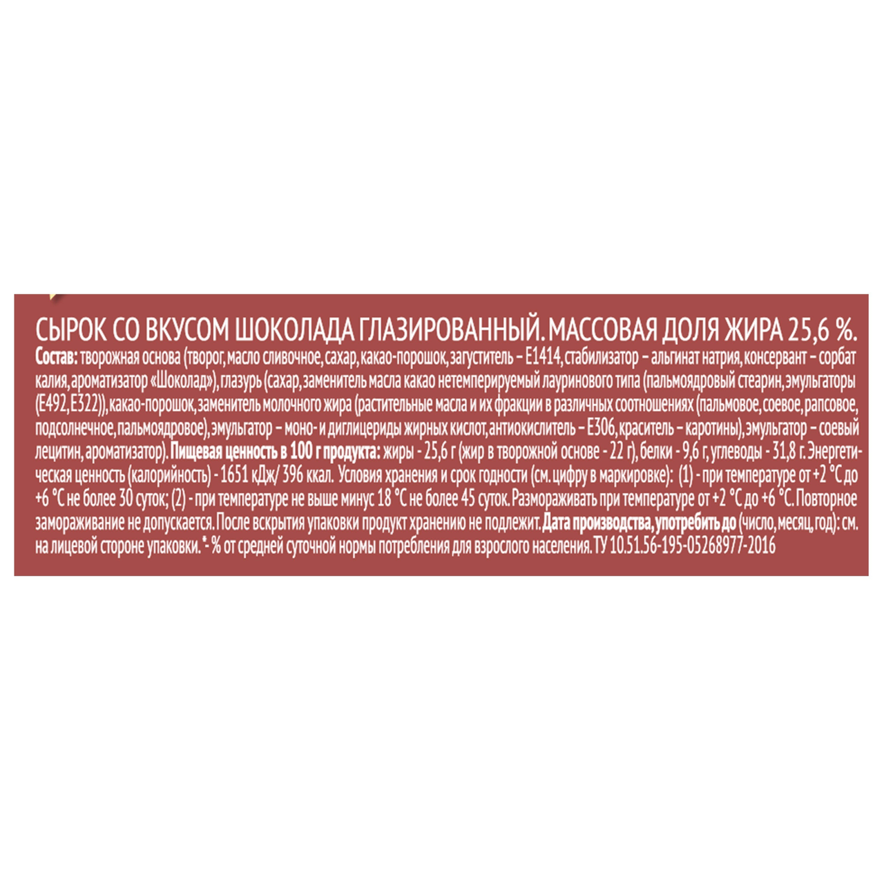 АО "Вимм-Билль-Данн". Состав: творожная основа (творог, сахар, масло сливочное, кака-порошок, загуститель-Е1414, стабилизатор - альгинат натрия, ароматизатор Шоколад, консервант - сорбат калия), глазурь (сахар, какао порошок, заменитель масла какао, заменитель молочноно жира (растительные масла, эмульгатор - моно и диглицериды жирных кислот, антиокислитель - Е306, краситель - каротины), эмульгатор - соевый лецитин, ароматизатор). Пищевая ценность: белки 8,7г, жир 25,6г (жир в творожной основе - 22г), углеводы 33,0г. Энергетическая ценность: 397 ккал. Хранить при температуре от +2'C до +6'C. Срок хранения 30 суток. ТУ 10.51.56-195-05268977-2016 Состав короба: 36шт.