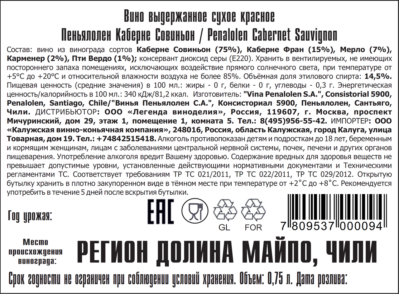Вино Clos Quebrada De Macul Penalolen Cabernet Sauvignon красное сухое, 0.75л производится из винограда сортов Каберне Совиньон: 75%, Каберне Фран: 10%, Пти Вердо: 8%, Мерло: 4%, Карменере: 3%, выращенных на виноградниках в прохладном климате Чили в Центральной и Долине Маипо. Плоды собираются при достижении полной зрелости, отправляются на винодельню, где тщательно сортируются и на протяжении 7 дней при температуре 27-29С подвергаются алкогольной ферментации. При этом сусло тщательно помешивают до 3-6 раз в сутки. Мацерация длится 25-28 дней. Выдержка вина осуществляется во французских однолетних и двухлетних дубовых бочках в течение 16-19 месяцев, время от времени вино дегустируется. Вино декантируют в первый год выдержки, при этом оно подвергается легкой микрооксидации, повторяющейся каждые три месяца. Со второго года контакта с кислородом стараются избегать. Последняя дегустация вина осуществляется непосредственно перед бутилированием. Вино обладает темно-рубиновым цветом с гранатово-красным отражением. Вкус напитка сочный, богатый, с фруктовыми оттенками, нотками паприки и мяты, легкой, устойчивой кислотностью и послевкусием. Аромат вина богатый, изобилует тонами спелых фруктов, пряностей и ментола. Напиток прекрасно сочетается с красным мясом, крупной дичью. Рекомендуется сервировать охлажденным до температуры 16-18С.