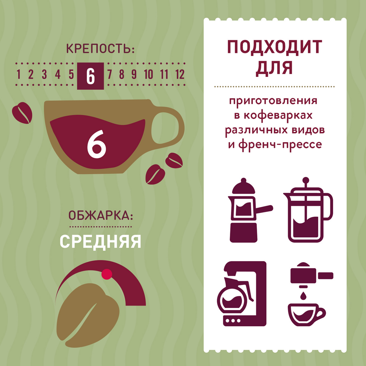 Натуральный кофе в зернах средней обжарки (6 из 12). Полный вкус с медовыми оттенками. Соблазнительный и многогранный. Обладает полным вкусом с элегантными фруктовыми нотками и лёгкой сладостью в эспрессо, а также нотками медового кекса в напитках с молоком. Подходит как для черного эспрессо, так и для кофе с добавлением молока. Медленная обжарка зерен раскрывает вкус и аромат кофе. Идеально подходит для приготовления в кофе-машине, электрической капельной кофеварке, гейзерной кофеварке, френч-прессе, турке.