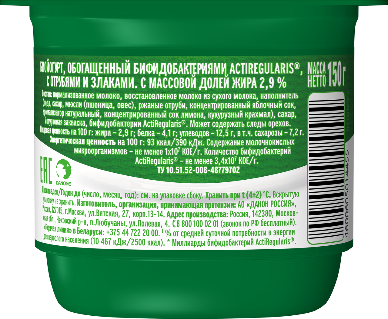 Натуральный густой биойогурт с отрубями и злаками. Способствует комфортному пищеварению благодаря бифидобактериям ActiRegularisв составе. 100% без консервантов и искусственных добавок. Полезный перекус на каждый день.
