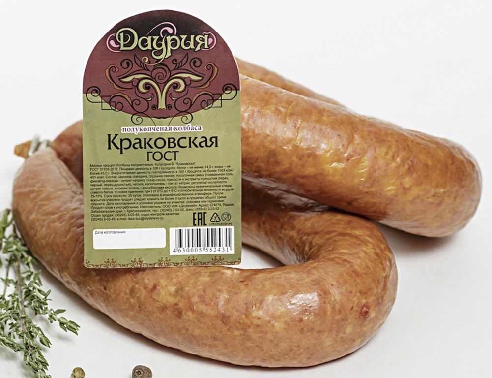 Готовится по классической рецептуре, из нескольких видов мяса с добавлением ароматных специй. Копчение, которое проходит на натуральной щепе, придает еще более насыщенный вкус. Колбаса легко нарезается на ломтики, ее можно использовать для бутербродов, закусок, оформления мясной нарезки и т.д. Включения шпика добавляют мягкости и сочности продукту. Краковская производится из отборного сырья, с пристальным контролем качества на каждом этапе изготовления.