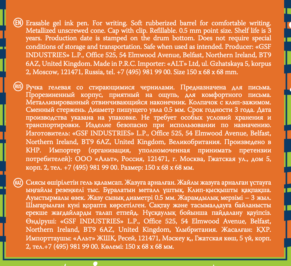 Ручка обладает уникальными обесцвечивающимися чернилами. При письме и стирании ручка не повреждает структуру бумаги, делая исправления незаметными. Чернила синего цвета. Разноцветный корпус ручки выполнен из пластика. Форма корпуса — круглая. Диаметр корпуса ручки: 8,5 мм. Длина ручки: 145 мм. Длина стержня: 130 мм. Толщина линии письма — 0,5 мм. Форма наконечника — пулевидная. Ручка имеет возможность замены стержня, что означает многократное использование.
