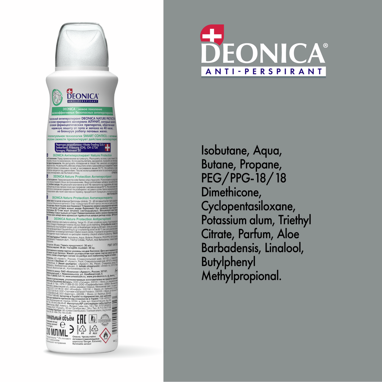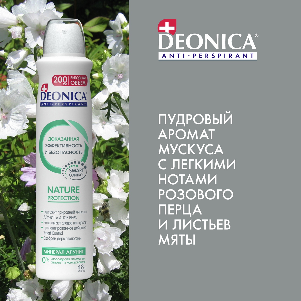 Наслаждайтесь комфортом и свежестью с женским дезодорантом-антиперспирантом Deonica Nature Protection. Природный минерал Алунит, в составе, обеспечивает надежную защиту от пота и неприятного запаха до 48 часов, при этом, не блокируя работу потовых желез. Алое вера смягчает, тонизирует и освежает кожу подмышек, ускоряет процессы регенерации. Активные вещества обладают бактерицидным эффектом, снимают раздражения и покраснения. Пудровый аромат мускуса с тонкими акцентами розового перца и свежестью листьев мяты создает утонченную и нежную композицию, которая окутывает легкой вуалью изысканности. Бархатистые мускусные ноты придают аромату мягкость и глубину, в то время как пикантный оттенок розового перца добавляет едва уловимую остроту. Свежесть листьев мяты завершает букет, наполняя его прохладой и бодрящей легкостью. Дезодорант без солей алюминия, этилового спирта и парабенов, подходит для всех типов кожи, не вызывая раздражений и пересушивания.