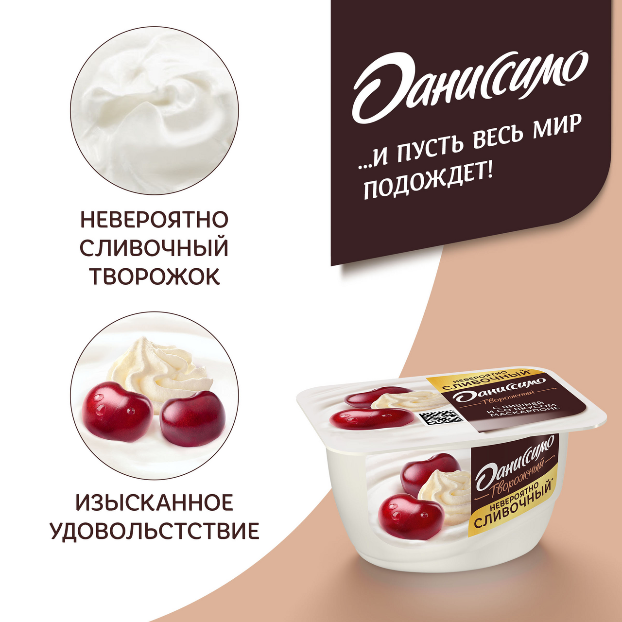 Новый творожный десерт Даниссимо с вишней и со вкусом маскарпоне вдохновлен рецептами Италии. Благодаря двойному смешиванию сливок и творога, Даниссимо имеет особую текстуру нежного крема. А изысканное сочетание крупных кусочков сочной вишни и сливочного вкуса маскарпоне придется по вкусу всем ценителям фруктовых десертов.