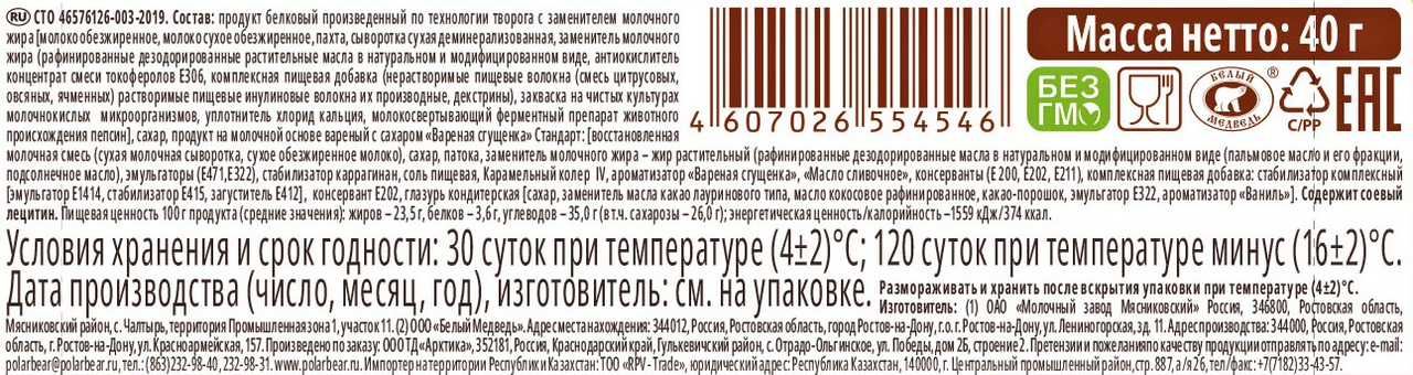 Продукт белковый произведённый по технологии творога с заменителем молочного жира (молоко обезжиренное, молоко сухое обезжиренное, пахта, сыворотка сухая деминерализованная, заменитель молочного жира рафинированные дезодорированные растительные масла в натуральном и модифицированном виде, антиокислитель концентрат смеси токоферолов Е306, комплексная пищевая добавка нерастворимые пищевые волокна смесь цитрусовых, овсяных, ячменных растворимые пищевые инулиновые волокна их производные, декстрины, закваска на чистых культурах молочнокислых микроорганизмов, уплотнитель хлорид кальция, молокосвертывающий ферментный препарат животного происхождения пепсин), сахар, продукт на молокосодержащей основе варёный с сахаром Варёная сгущёнка, стандарт: (восстановленная молочная смесь сухая молочная сыворотка, сухое обезжиренное молоко, сахар, патока, заменитель молочного жира – жир растительные рафинированные дезодорированные масла в натуральном и модифицированном виде пальмовое масло и его фракции, подсолнечное масло, эмульгаторы Е471, Е322, стабилизатор каррагинан, соль пищевая, Карамельный колер, ароматизатор Варёная сгущёнка, Масло сливочное, консерванты Е200, Е202, Е211, комплексная пищевая добавка: стабилизатор комплексный (эмульгатор Е1414, стабилизатор Е415, загуститель Е412), консервант Е202, глазурь кондитерская (сахар, заменитель масла какао лауринового типа, масло кокосовое рафинированное, какао-порошок, эмульгатор Е322, ароматизатор Ваниль).