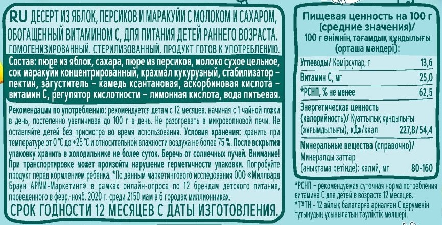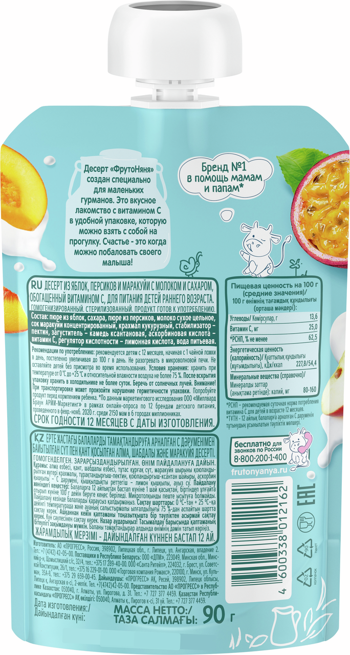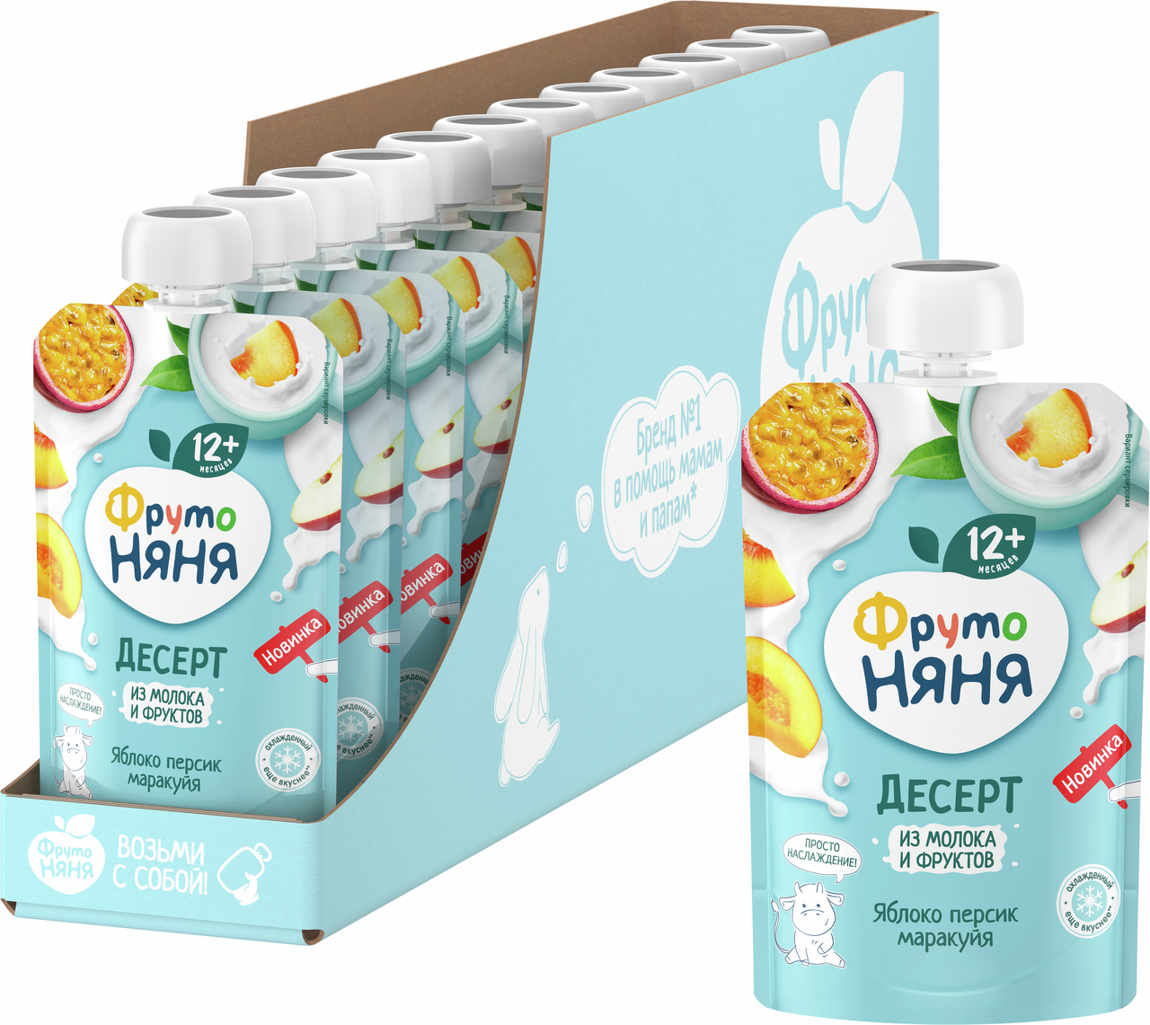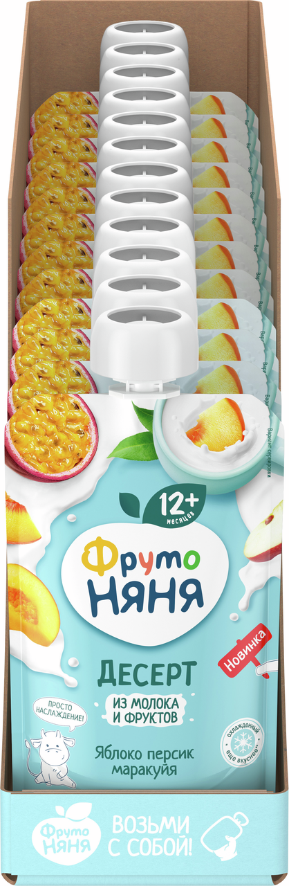 Молочный десерт из яблок, персиков и маракуйи ФрутоНяня - это вкусное и полезное угощение с тропическими нотками для детей от 12 месяцев. Продукт приготовлен из 100% натуральных фруктовых пюре и соков. Состав дополнительно обогащен витамином С для укрепления иммунитета. Разве нужен повод, чтобы побаловать малыша вкусным и полезным лакомством? Мягкую упаковку 90г удобно брать с собой, чтобы ребенок в любое время мог зарядиться дополнительной энергией и насладиться тропическим фруктовым вкусом.
