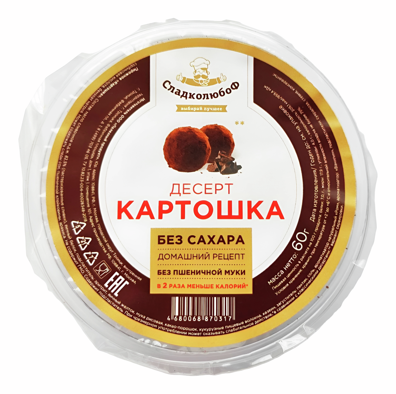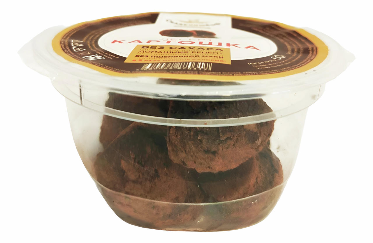 В картошке не содержится сахар, а сладость придают натуральные природные подсластители, нет пшеничной муки. Десерт имеет сниженную калорийность. Вкус картошки имеет насыщенный шоколадный вкус, а дополнительную яркость вкусу добавляют нотки рома.