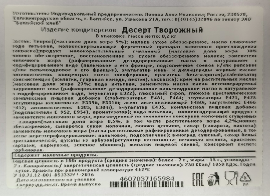 Творог ((массовая доля жира 9%); молоко сухое обезжиренное, масло сливочное (вода питьевая, молокосвертывающий ферментный препарат животного происхождения закваска); продукт молокорастительный сметанный (массовая доля жира 30% молоко обезжиренное, восстановленное из сухого обезжиренного молока; заменитель молочного жира (рафинированные дезодорированные масла в натуральном и модифицированном виде (пальмовое и его фракции, подсолнечное соевое и/или рапсовое и/или пальмоядровое и его фракции), эмульгатор моно- и диглицериды жирных кислот антиокислитель концентрат смеси токоферолов, краситель бета-каротин), стабилизатор консистенции (желатин, гуаровая камедь, пектин), закваска); крем на растительных маслах массовая доля жира 27%; вода питьевая, заменитель масла какао нетемперируемый лауринового типа (рафинированное дезодорированное пальмоядровое масло в натуральном и модифицированном виде, эмульгатор Е322), глюкозный сироп, глюкоза кристаллическая комплексная пищевая добавка (стабилизаторы: Е481, Е464; эмульгаторы Е471, Е475 регуляторы кислотности: Е339іі, Е331іії; агент антислеживающий Е460і, загустители: Е466 3412; антиокислители: Е385, Е3041), эмульгатор Е435, комплексная пищевая добавка подсластители Е952, Е954), ароматизатор); вода питьевая, молокосодержащий продукт с заменителем молочного жира, произведенный по технологии консервов молочных сгущенных с сахаром (массовая доля жира 8,5%, в том числе растительного жира 4,2%; молоко обезжиренное, сыворотка сухая молочная, молоко цельное, сахар (сахароза, лактоза) заменитель молочного жира (масла растительные рафинированные дезодорированные, в том числе переэтерифицированные: пальмовое, подсолнечное); виноград сушеный, сахар белый кристаллический, цукаты из арбузов (регулятор кислотности: лимонная кислота, красители картазин, кармуазин, зеленое яблоко); желатин пищевой свиной, консервант кислота сорбиновая.