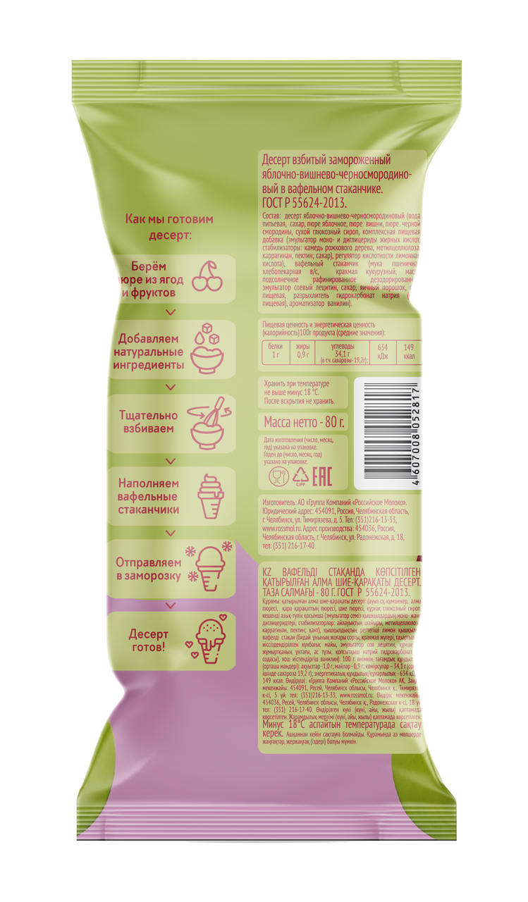 Десерт яблочно-вишнево-черносмородиновый (вода питьевая, сахар, пюре яблочное, пюре вишни, пюре черной смородины, сухой глюкозный сироп, комплексная пищевая добавка (эмульгатор моно- и диглицериды жирных кислот, стабилизаторы: камедь рожкового дерева, метилцеллюлоза, каррагинан, пектин; сахар), регулятор кислотности лимонная кислота), вафельный стакан (мука пшеничная хлебопекарная высшего сорта, крахмал кукурузный, масло подсолнечное рафинированное дезодорированное, эмульгатор соевый лецитин, сахар, яичный порошок, соль пищевая, разрыхлитель гидрокарбонат натрия (сода пищевая), ароматизатор ванилин).