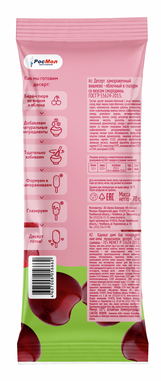 Десерт вишнево-яблочный (вода питьевая, сахар, пюре вишни, пюре яблочное, сухой глюкозный сироп, комплексная пищевая добавка (эмульгатор моно- и диглицериды жирных кислот, стабилизаторы: камедь рожкового дерева, метилцеллюлоза, каррагинан, пектин, сахар), регулятор кислотности лимонная кислота, краситель натуральный свекольный, ароматизатор), глазурь с растительным жиром со вкусом смородины (масло кокосовое рафинированное дезодорированное, пудра сахарная, молоко сухое обезжиренное, эмульгатор лецитин соевый, ароматизатор, пищевая добавка- краситель кармин Е120, регулятор кислотности лимонная кислота, пищевой краситель (краситель кармин Е120, эмульгатор Е491, антиокислители Е307 и Е304, консервант Е200).