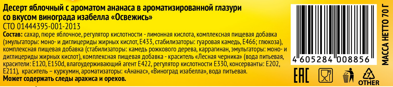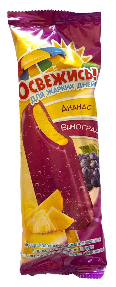 Десерт яблочный с ароматом ананаса в ароматизированной глазури со вкусом винограда изабелла Освежись. Десерт хорошо освежает и тонизирует, поднимает настроение и дарит ощущение приятной прохлады.