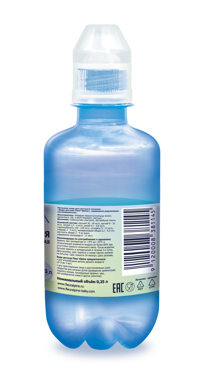 Детскую природную родниковую воду Fleur Alpine для детей с рождения оценят не только малыши, но также и взрослые члены семьи: Вода разливается в бутылки в высокогорной части Австрийских Альп в исторической природоохранной зоне непосредственно на источнике Сойзенштайн. Прежде чем попасть в бутылки, вода проходит естественную фильтрацию через альпийские известняковые породы - природная структура воды полностью сохраняется. Вода имеет высокое содержание природного кислорода, что делает ее воистину живой. Вода имеет низкую степень минерализации, что позволяет сохранить сбалансированность минерального состава детского питания, для разведения которого она используется. Бутылочки привлекают своим ярким дизайном и представлены в двух цветах - розовом и голубом. Благодаря насадке для питья Sport Cap и эргономичной форме бутылочка очень удобна для подросшего малыша.