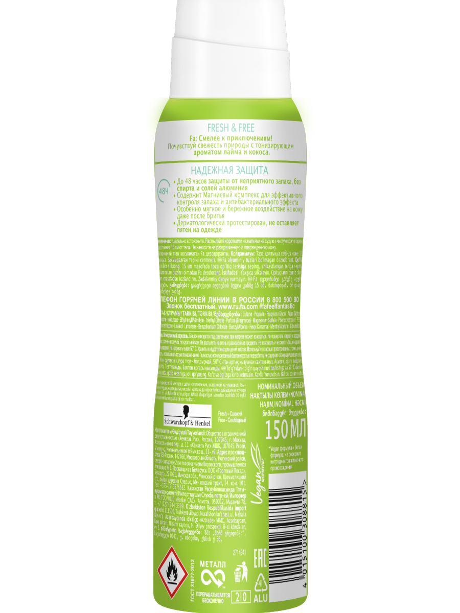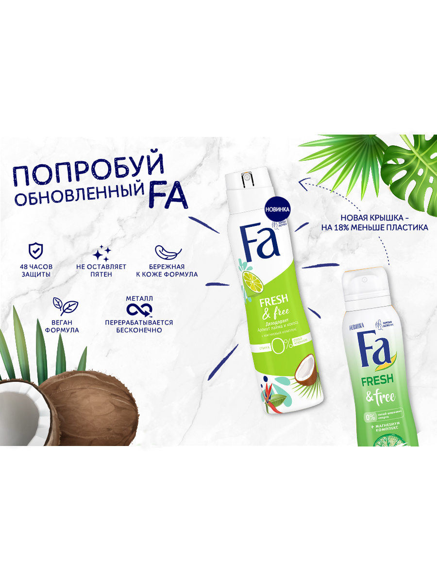 Fa дезодорант-аэрозоль Fresh&Free c ароматом лайма и кокоса без солей алюминия и с 0% содержания спирта в составе обеспечивает до 48 часов длительной защиты от неприятного запаха. Содержит новый магнезиум комплекс для эффективного контроля запаха и антибактериального эффекта, против пятен. Оказывает особенно мягкое и бережное воздействие на кожу даже после бритья. C заботой об окружающей среде: биоразлагаемая формула более, чем на 80%. Дерматологически протестирован, веган формула.Побалуй свои чувства вдохновляющими ароматами путешествий вместе с Fa. Почувствуй свежесть природы с тонизирующим ароматом лайма и кокоса.