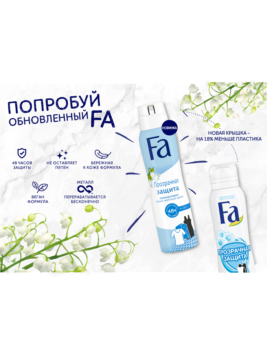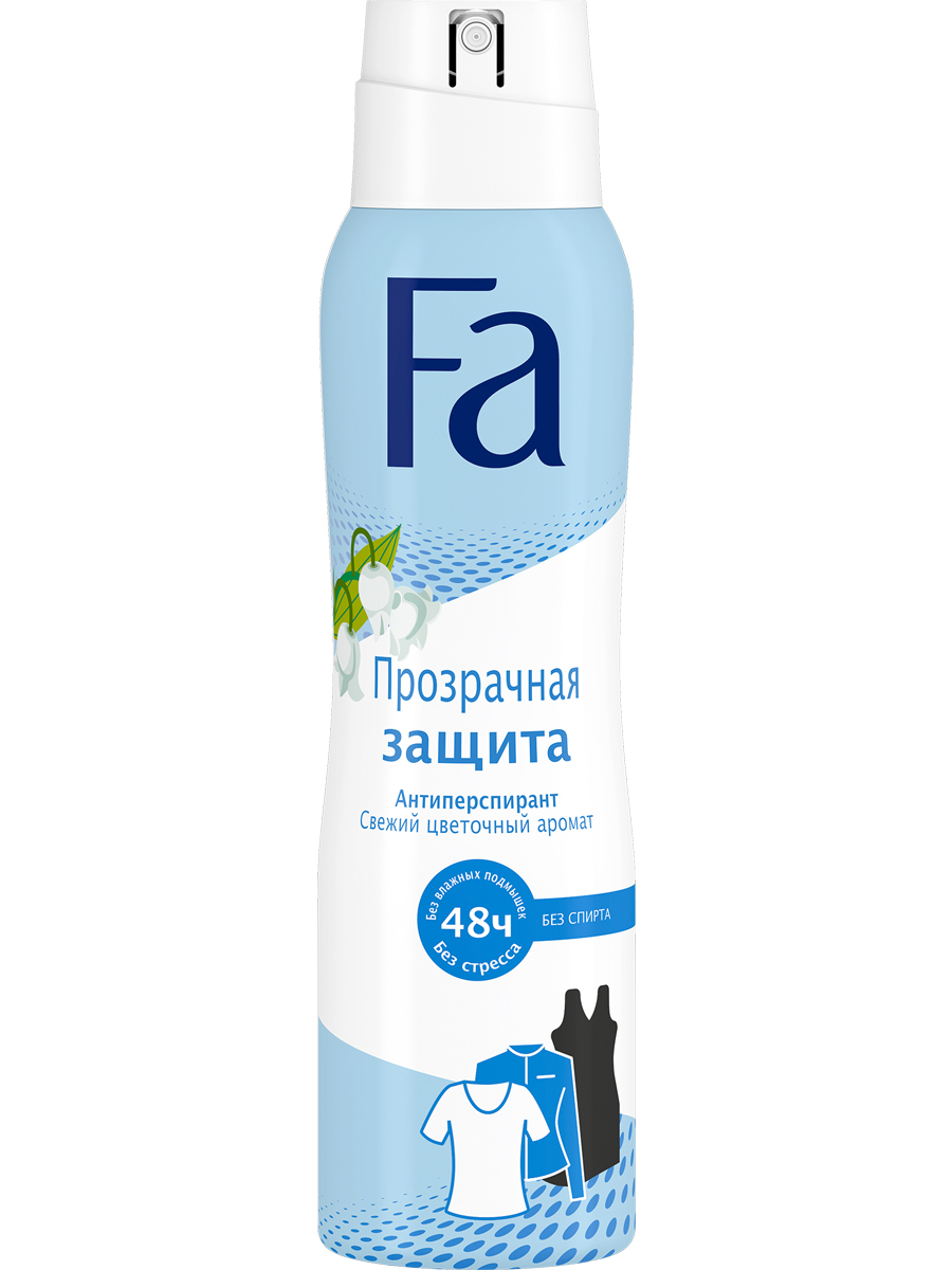 Fa антиперспирант-аэрозоль Прозрачная защита с технологией против пятен обеспечивает защиту от пота и запаха до 48 часов без спирта. Почувствуй защиту и уверенность во время активного дня! Прозрачная защита со свежим цветочным ароматом, проверенная на тканях разных типов и цветов. Длительная защита против пятен, проверенная на разных типах и цветах тканей. Дерматологически протестировано, бережная к коже формула.