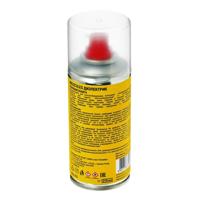 Разработан для защиты электрооборудования от негативного воздействия окружающей среды, влаги, коррозии и окисления. Обрабатываемые элементы не требуют предварительной подготовки. Диэлектрик Molecules многократно улучшает токопроводимость элементов, повышает сопротивление изоляции, снижает риск возникновения короткого замыкания, продлевает срок службы электронных и электрических соединений и оборудования.