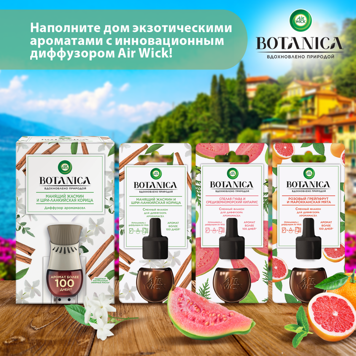 Ароматы Botanica изготовлены из натуральных ингредиентов, тщательно собранных с заботой об окружающей среде.* Современный диффузор Air Wick Botanica наполнит дом длительным ароматом** бодрящего розового грейпфрута в сочетании со свежими нотками марокканской мяты. *Cогласно отчету АрЭндДи Рекитт Бенкизер № ACS-218 от 14.04.2020г., г. Халл, Великобритания**При использовании на минимальных настройках несколько часов в день, согласно отчету АрЭндДи Рекитт Бенкизер “Project i8 Russia от 10.03.2020г., г. Халл, Великобритания