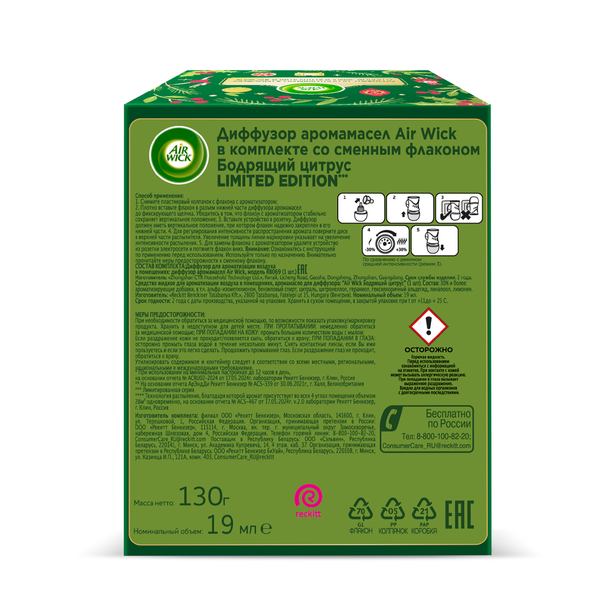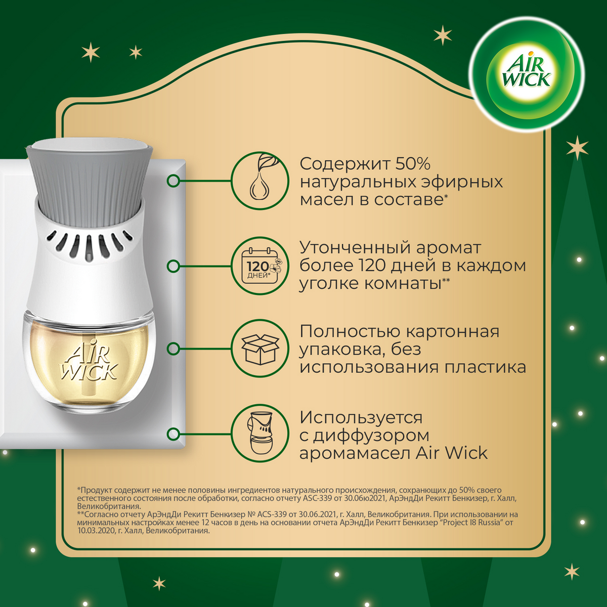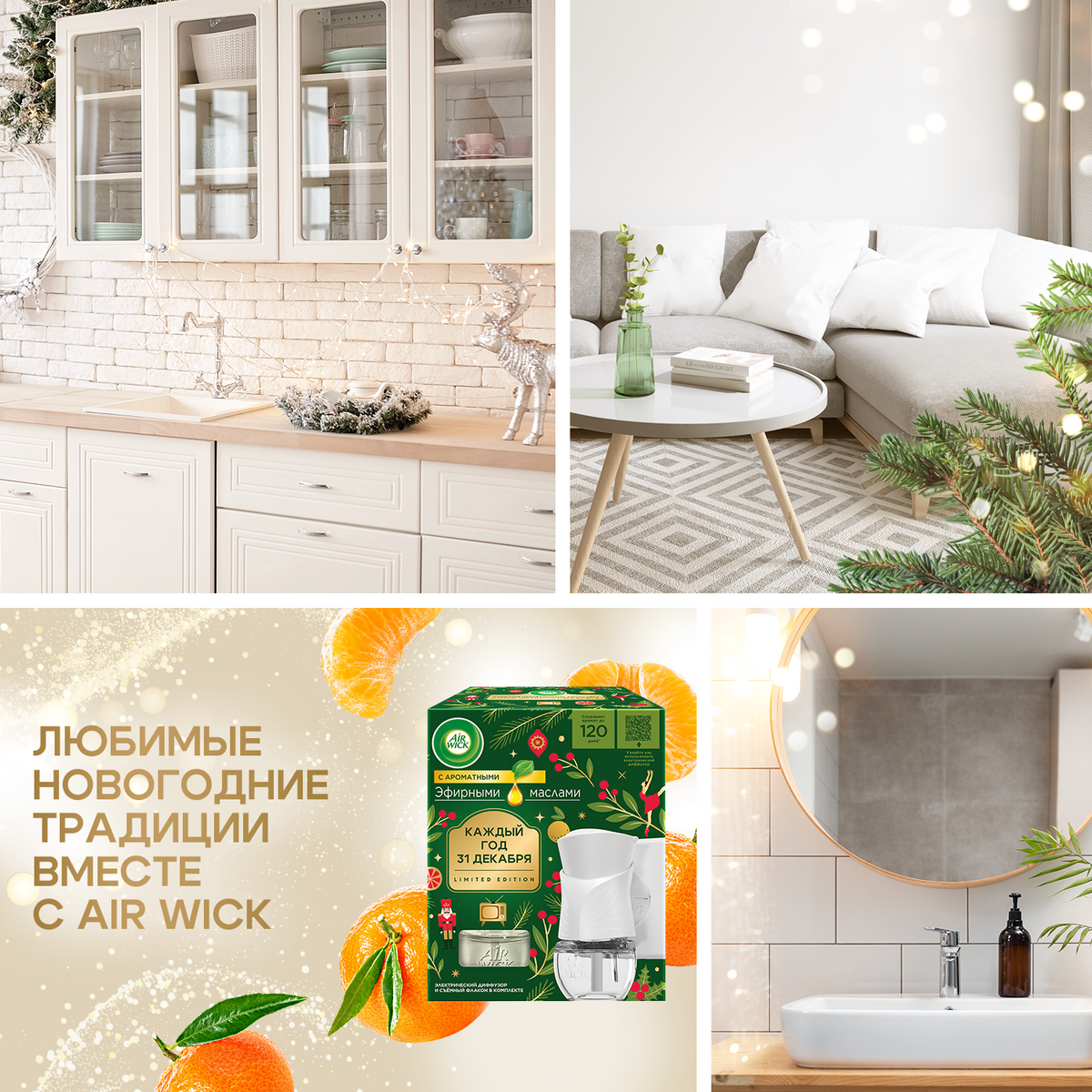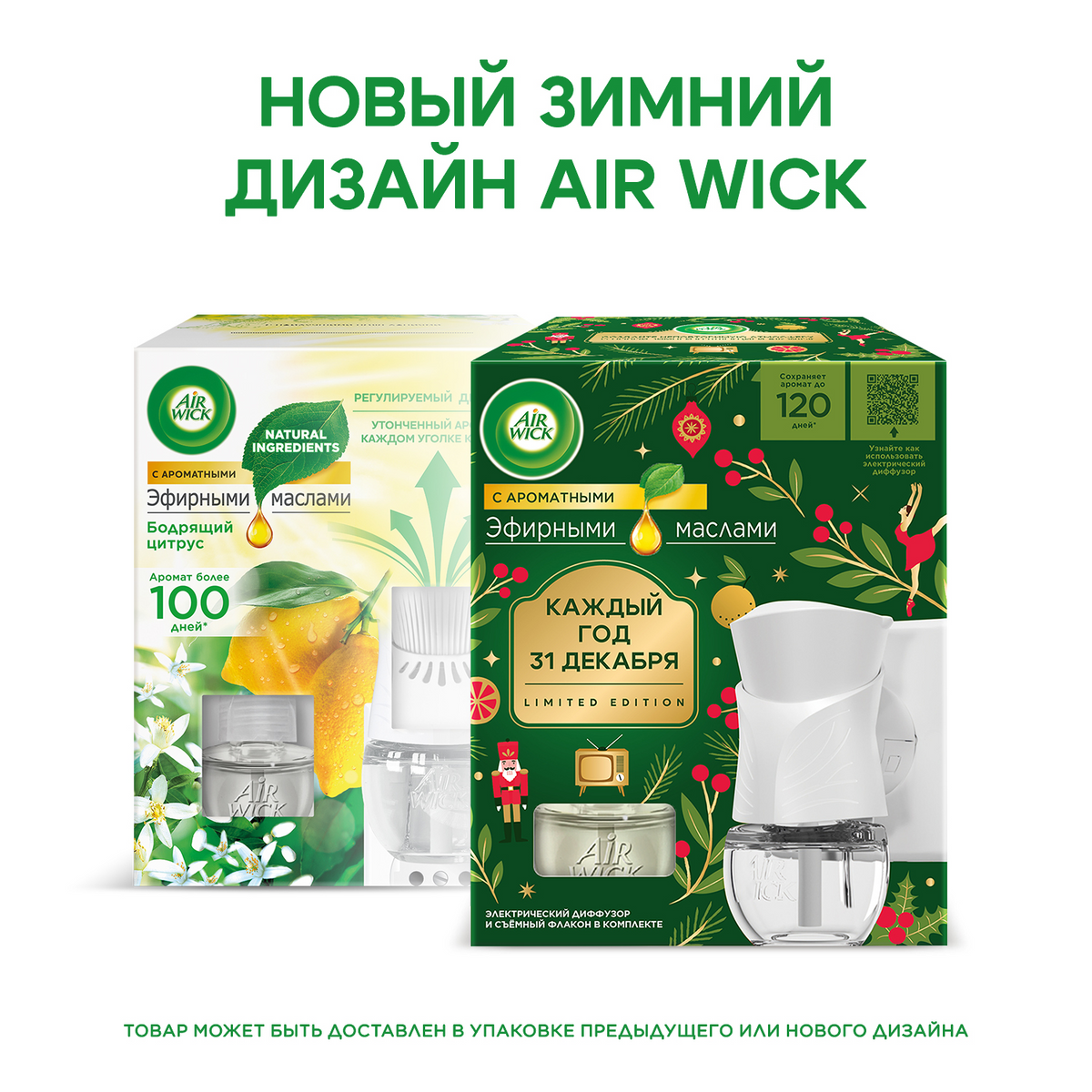 Насладитесь освежающим бодрящими нотками цитрусовой цедры. Подарите дому более 100 дней деликатного аромата с диффузором аромамасел Air Wick*. *При использовании на минимальных настройках несколько часов в день, согласно отчету АрЭндДи Рекитт Бенкизер.