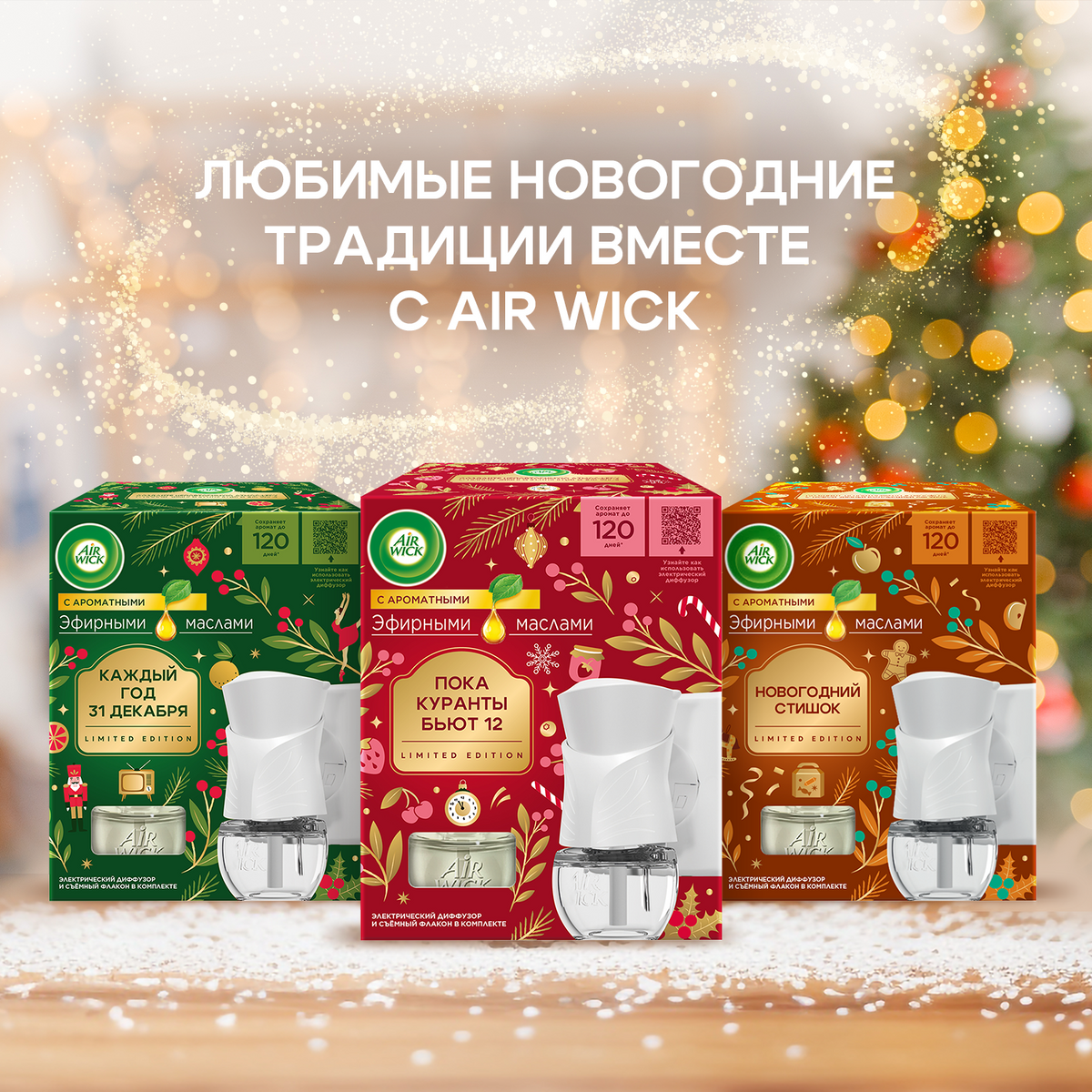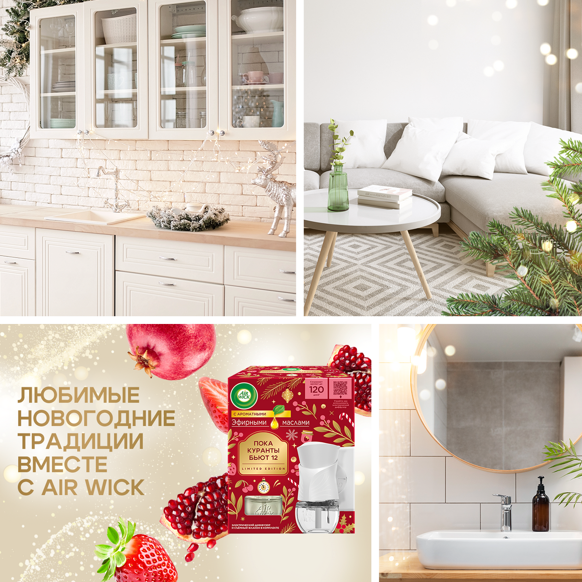 Насладитесь бодрящими нотками дикого граната. Подарите дому более 100 дней деликатного аромата с диффузором аромамасел Air Wick*. *При использовании на минимальных настройках несколько часов в день, согласно отчету АрЭндДи Рекитт Бенкизер “Project i8 Russia от 10.03.2020г., г. Халл, Великобритания.