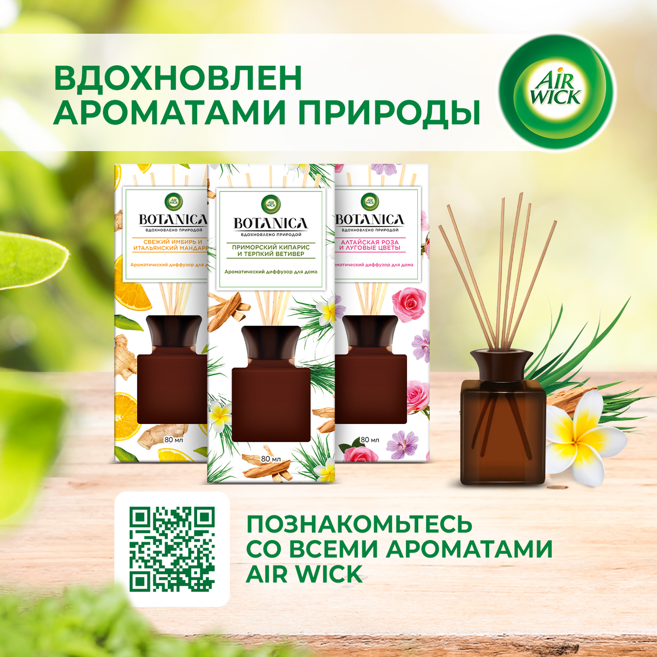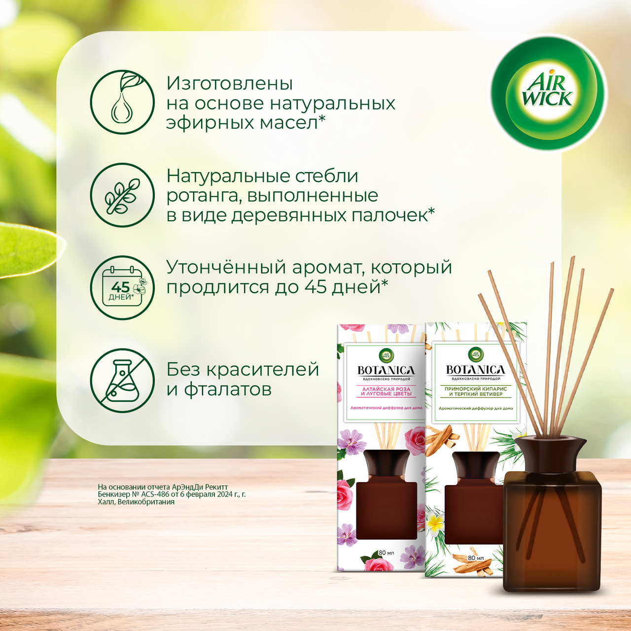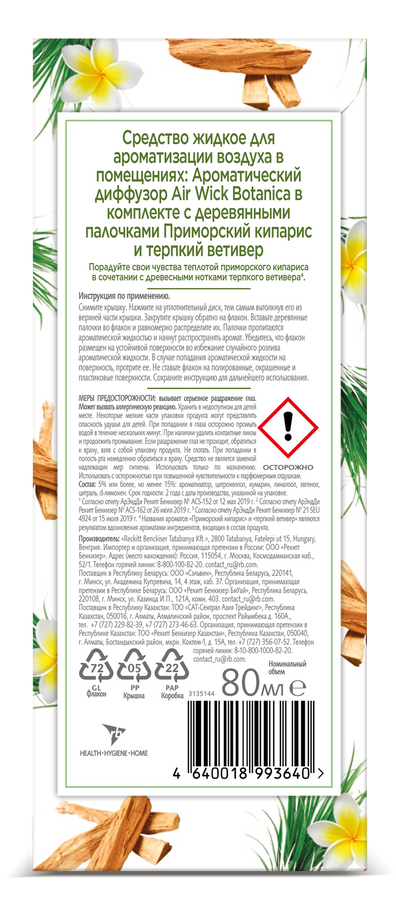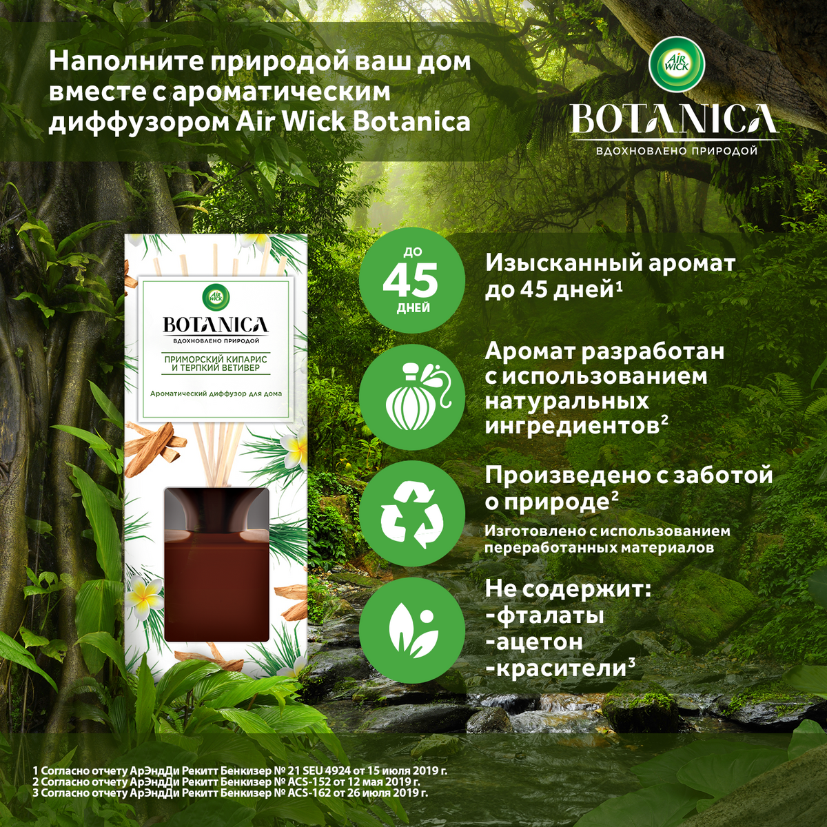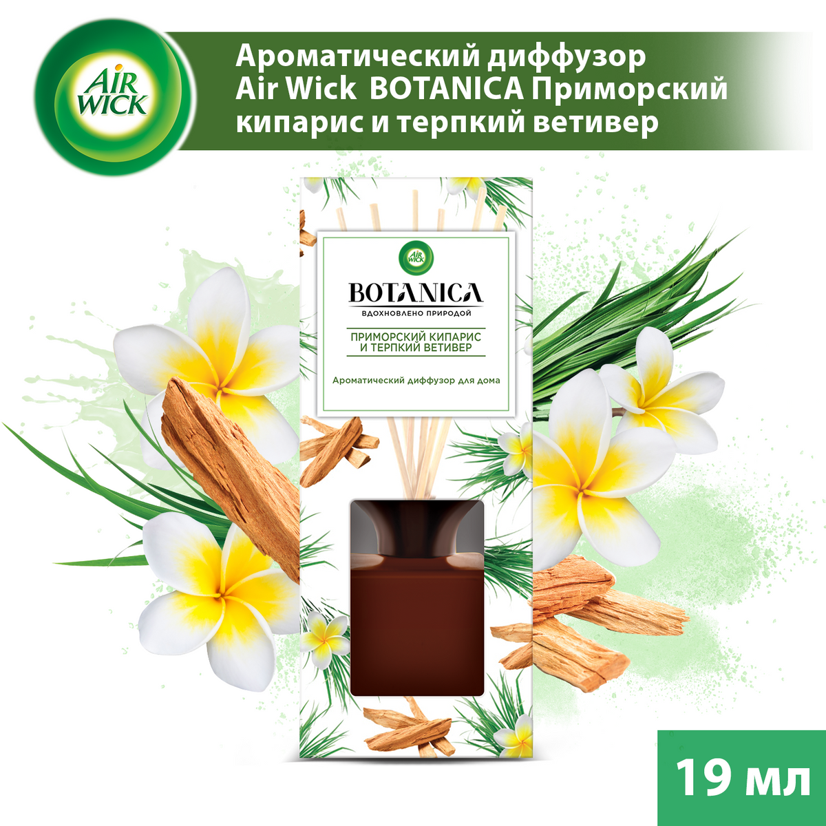 Порадуйте свои чувства теплотой приморского кипариса в сочетании с древесными нотками терпкого ветивера. Арома-диффузор AirWick Botanica является новой линейкой натуральных ароматов. В его составе более натуральные компоненты без ацетона, красителей, фталатов, на водной основе. Он содержит эфирные масла, а палочки из стебля ротанга сохраняют аромат до 45 дней.