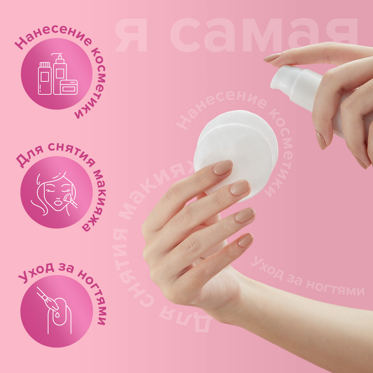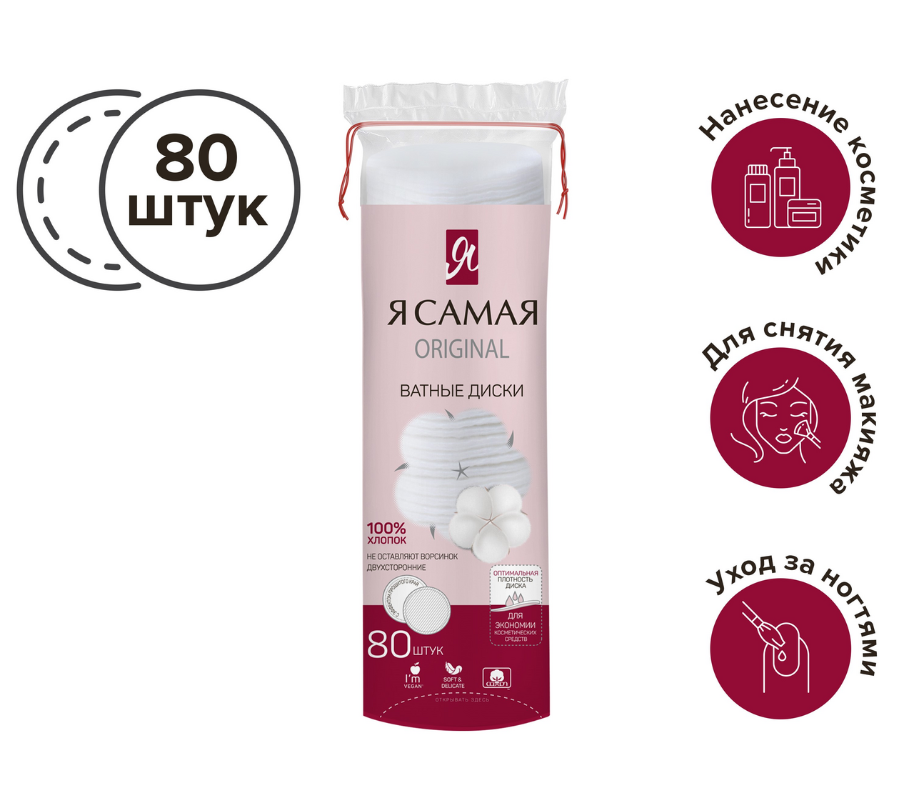 Ватные диски Я самая мягкие и нежные, 80 шт. – это универсальное средство гигиены. Косметические хлопковые двусторонние диски прошиты по краю и подходят как для коррекции и удаления макияжа, так и для личной гигиены. За счет рельефной поверхности жидкость на диске распределяется равномерно. Продукт обладает оптимальной впитывающей способностью и благодаря своей мягкой и нежной структуре хорошо очищает кожу. Средство не вызывает раздражения и подходит даже для самой чувствительной кожи, так как не содержит примесей синтетических волокон.