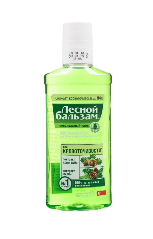 Профилактический ополаскиватель для полости рта Лесной бальзам на отваре трав обладает иммуноактивным действием, помогает решить проблему кровоточивости десен и в 2 раза улучшает работу собственного иммунитета полости рта, снижая риск развития проблем с деснами*. Клинически-доказанный эффект:С первого применения улучшает состояние десен*До 94% снижает кровоточивость десен при регулярном использовании**В 5 раз снижает скорость образования налета на зубах, уменьшая бактериальную нагрузку на мягкие ткани полости рта**не нарушает баланс микрофлоры полости ртаОсобенности состава:Насыщенный хвойный вкус. Содержит хвойных комплекс (на основе экстрактов пихты, живицы, можжевельника) с отваром 5 целебных трав, экстрактом коры дуба и соком алоэ. Такой сбалансированный состав способствует укреплению кровеносных сосудов десен, улучшает кровообращение и питание в мягких тканях полости рта, препятствует повторному возникновению кровоточивости при чистке зубов.Рекомендации:Ополаскиватель одобрен Стоматологической Ассоциацией России и рекомендован в качестве профилактического средства при воспалении и кровоточивости десен (гингивите, пародонтите). Использовать после каждой чистки зубов, а также после еды для очищения межзубных промежутков. Наполните колпачок ополаскивателем и тщательно прополощите полость рта в течение 30 секунд.Не требуется полоскать после использования водой. При кровоточивости десен рекомендуется использовать совместно с зубной пастой Лесной бальзам после каждой чистки зубов, а также тщательно полоскать полость рта после каждого приема пищи. В период ремиссии сохранить использование минимум 1 раз в день для предупреждения развития проблем десен и улучшения питания мягких тканей полости рта.Подходит для использования в ирригаторе.Подходит для использования в период беременности и лактации*Лесной бальзам поддерживает иммуните�� и усиливает эффективность работы естественных защитных функций полости рта. Свойства подтвержден