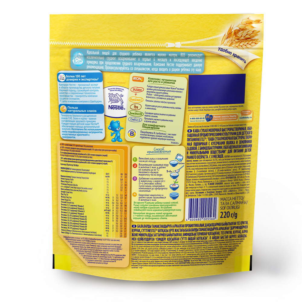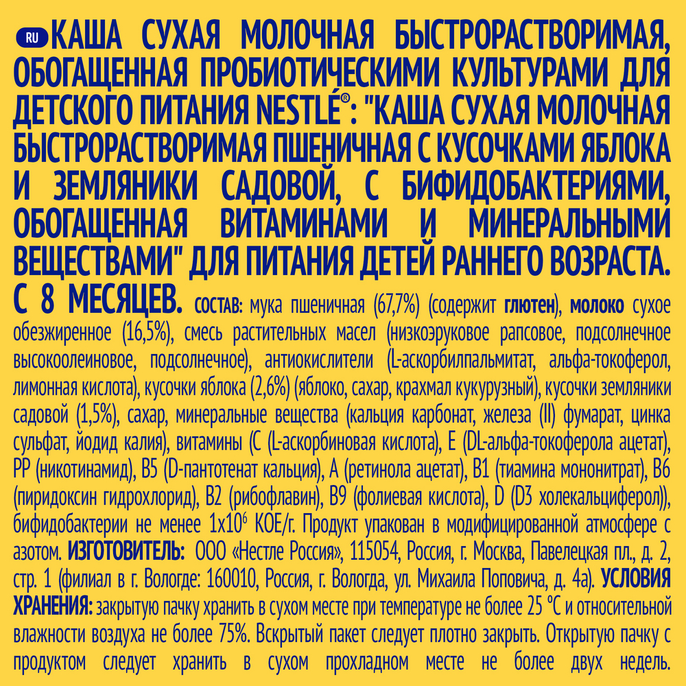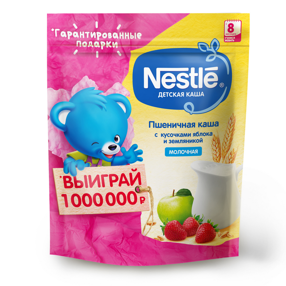 Каша для детей Nestle, молочная, пшеничная, с кусочками яблока и земляникой, с 8 месяцев, 220г
