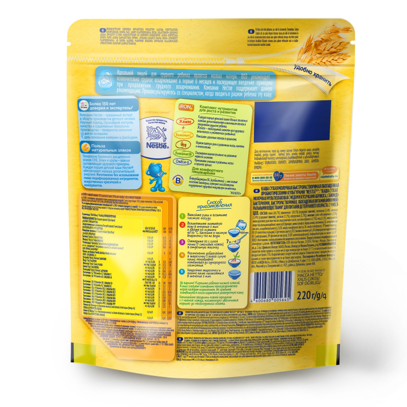 "Условия хранения: закрытую пачку хранить в сухом месте при температуре не более 25 С и относительной влажности воздуха не более 75 %. После приготовления каши вскрытый пакет следует плотно закрыть. После вскрытия упаковки продукт следует хранить не более 2-х недель.Срок годности: 15 месяцев. Дата изготовления и упаковывания, срок годности и, номер партии указаны на задней части упаковки.Не варите! Кормите ребенка чистой ложкой. Кашу следует готовить непосредственно перед каждым кормлением. Следуйте инструкции на упаковке. Не храните оставшуюся после кормления разведённую кашу. Начинайте вводить новый продукт с 1 чайной ложки, постепенно увеличивая порцию до необходимого объема."