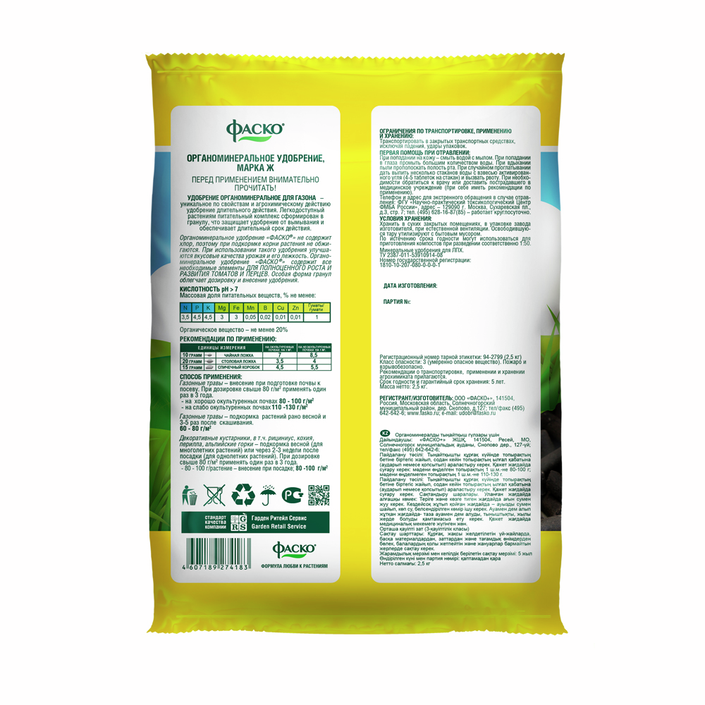 Удобрение для газона Фаско органоминеральное, 2,5 кг было разработано специально для улучшения газонов всех типов и декоративной растительности. Органоминеральное удобрение длительного действия поставляется в гранулах. Оно предназначено для основного внесения при закладке газона, а также для подкормки в период вегетации. Удобрение обеспечивает оптимальный баланс микроэлементов, важных для здорового роста травы. Применение удобрения не только увеличивает плодородие обветренных почв, но также гарантирует здоровый и крепкий газон. Регулярное использование удобрения обеспечит надежную защиту растительности, делая ее более устойчивой к заболеваниям и негативным воздействиям окружающей среды. Для достижения наилучших результатов при использовании данного продукта, необходимо следовать прилагаемой инструкции.