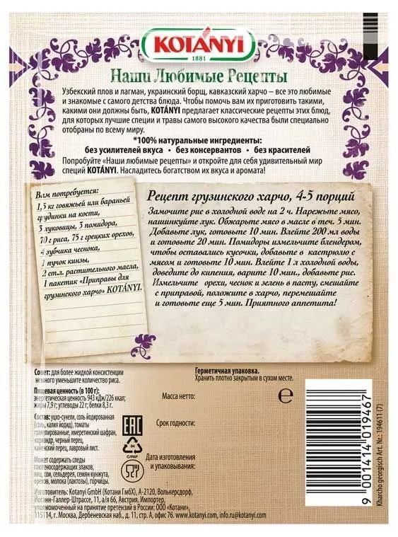Приправа торговой марки Kotanyi незаменима при приготовлении грузинского харчо по классическому рецепту. Именно с ней можно почувствовать настоящий вкус традиционных кавказских блюд, как в восточном ресторане. Собранные в герметичной упаковке пряности и специи высшего качества не включают искусственных консервантов и добавок. Готовая смесь содержит гранулированные томаты, уцхо-сунели, черный и кайенский перец, шафран и кориандр.