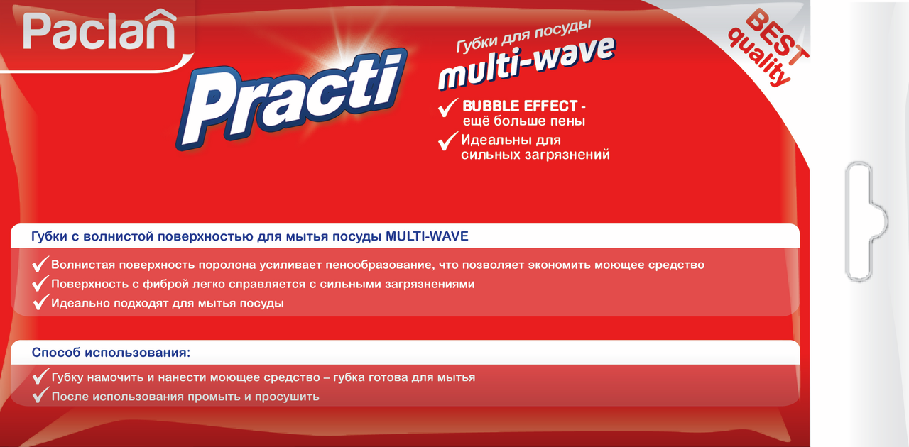 Губки для посуды Paclan Practi Multi-Wave 10 x 7 x 4 см, 5 шт. классической формы небольшого размера удобна и практична. Она состоит из основного широкого слоя и специального тонкого покрытия с абразивными свойствами. Они плотно скреплены между собой и не расслаиваются даже после многократного применения. Губка универсальная, подходит для мытья любой посуды (от тонкого фарфора до сковородок, казанов и противней). Она эффективно очищает любые загрязнения и не портит даже деликатные поверхности. Она помогает устранить остатки пищи, пригоревшую еду, жирные пятна. Ее можно использовать для очистки рабочих поверхностей и столов. Применять это изделие можно как в домашних условиях, так и на предприятиях общественного питания.