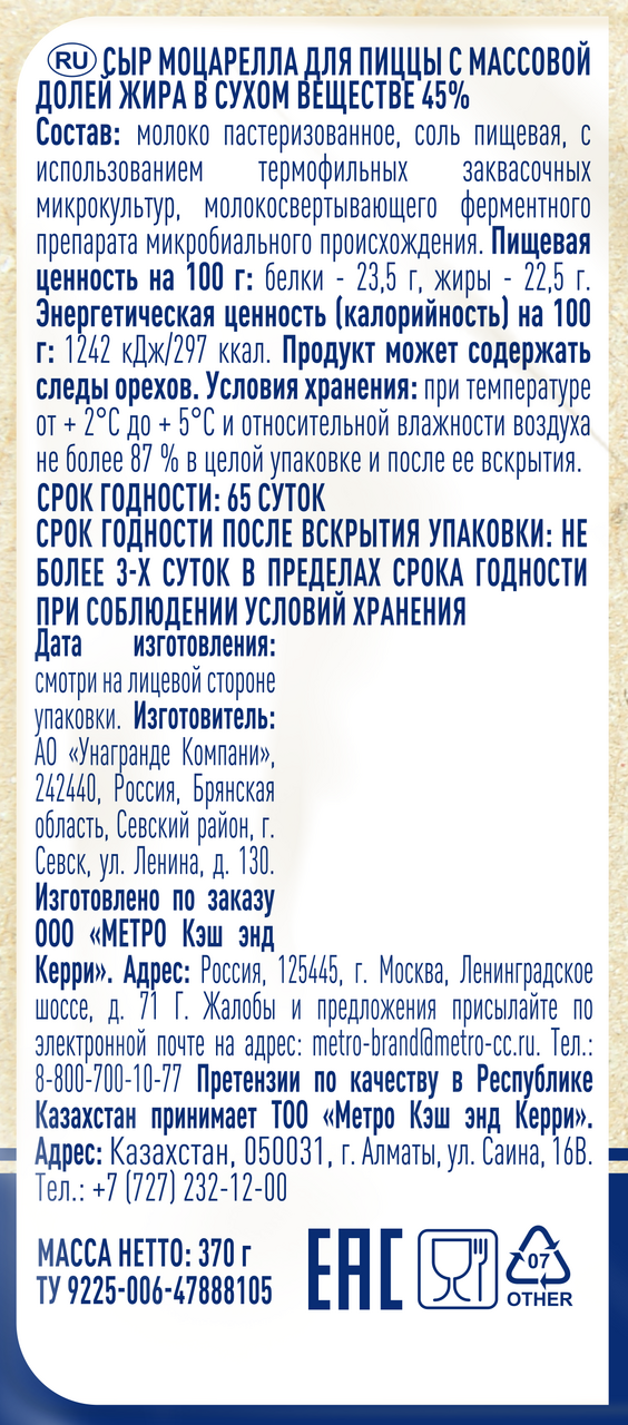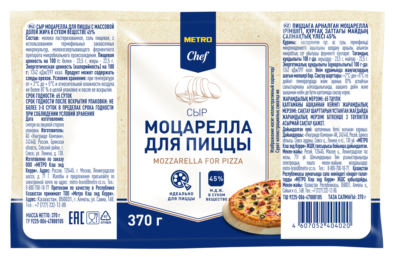 Metro Chef Сыр для пиццы Моцарелла 45%, 370г БЗМЖ. Моцарелла для пиццы - это наш любимый сыр для вкусной пиццы. Он изготовлен из тщательно отборного молока и имеет высокое содержание моцареллы - 45%. Этот сыр подарит вашей пицце неповторимый вкус и аромат.