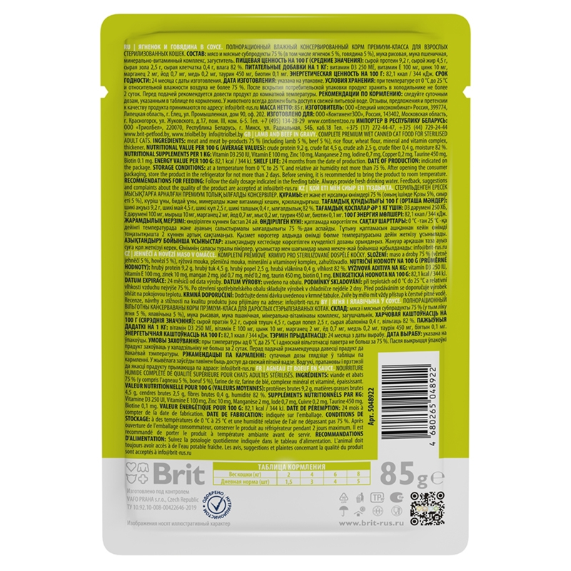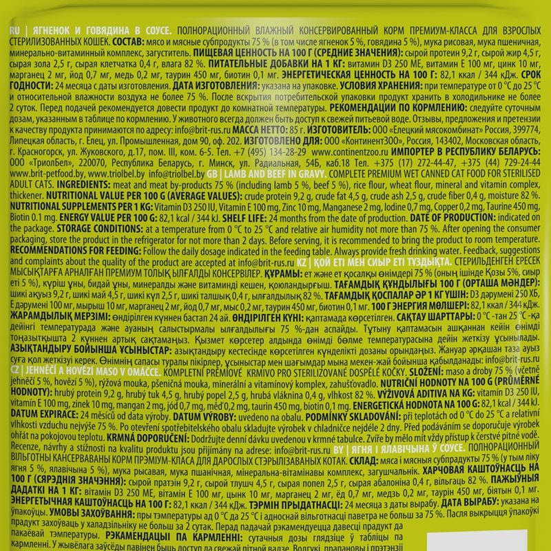 Корм влажный Brit Premium для стерилизованных кошек с ягненком и говядиной, 85г