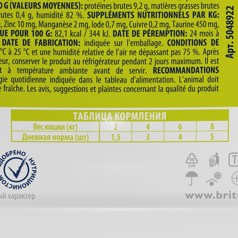 Нежные кусочки из филе говядины в ароматном соусе однозначно заинтересуют Вашу кошку и станут любимым блюдом для нее. Ведь в паучах Brit Premium содержится до 82% мяса! Влажный корм Brit Premium содержит все необходимые для полноценного питания наших любимцев витамины и минералы. Также в составе присутствует таурин – важный ингредиент для поддержания остроты зрения и здоровья сердечно-сосудистой системы кошек