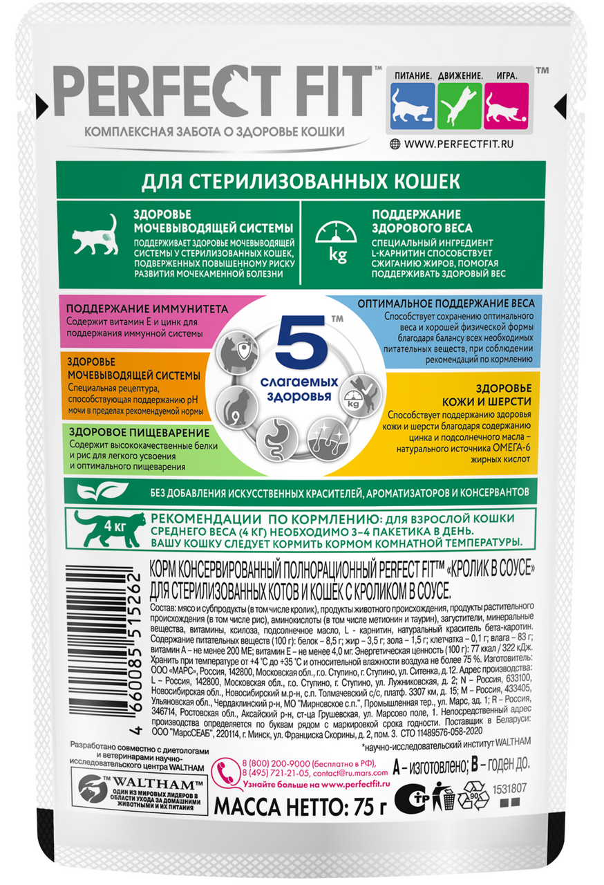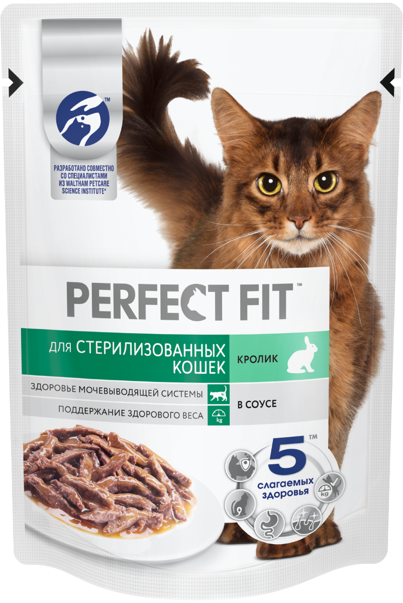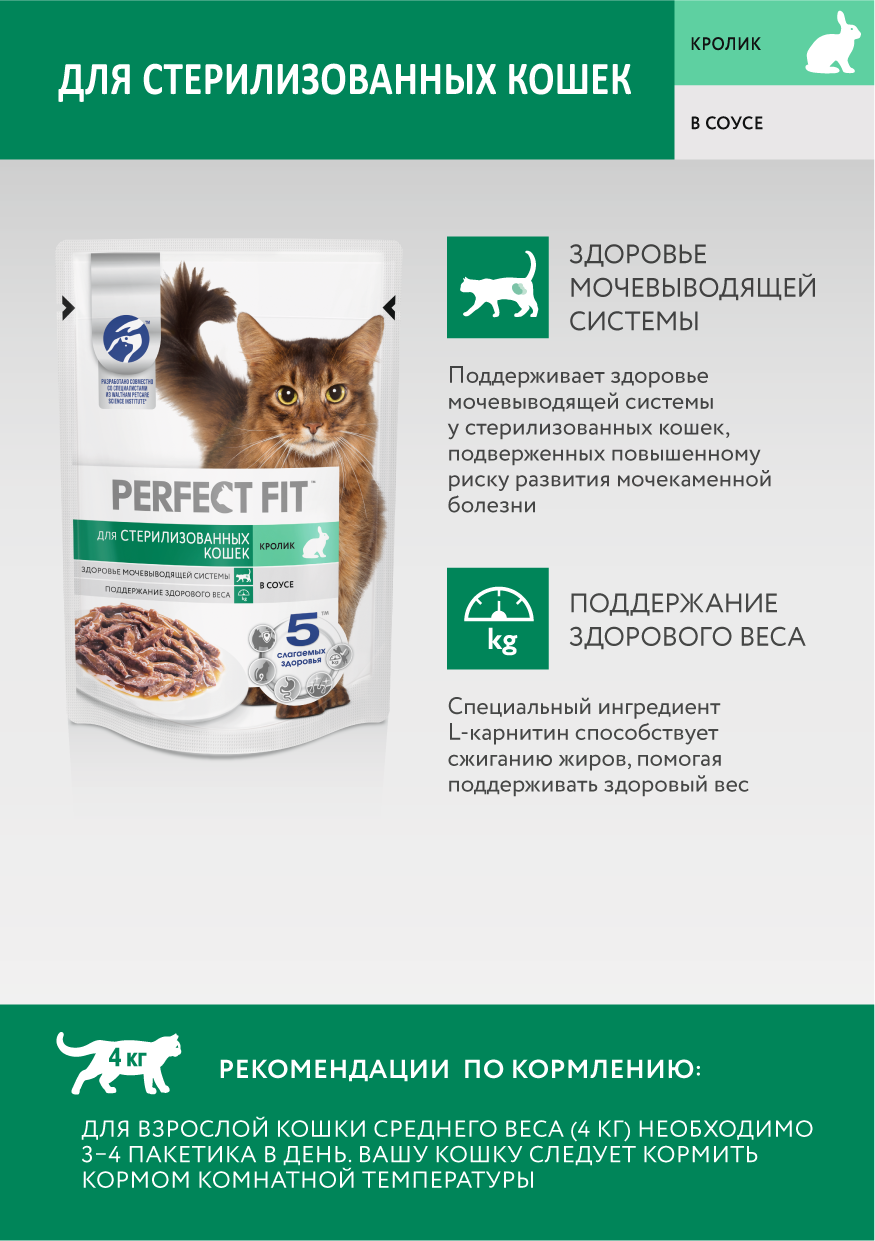 Влажный корм в паучах Perfect Fit с кроликом в соусе для стерилизованных кошек разработан по специальной рецептуре для контроля здоровья кошек, прошедших стерилизацию. Поддерживает здоровье мочевыводящей системы у стерилизованных кошек, подверженных повышенному риску развития мочекаменной болезни. Специальный ингредиент L-карнитин способствует сжиганию жиров, помогая поддерживать здоровый вес.
