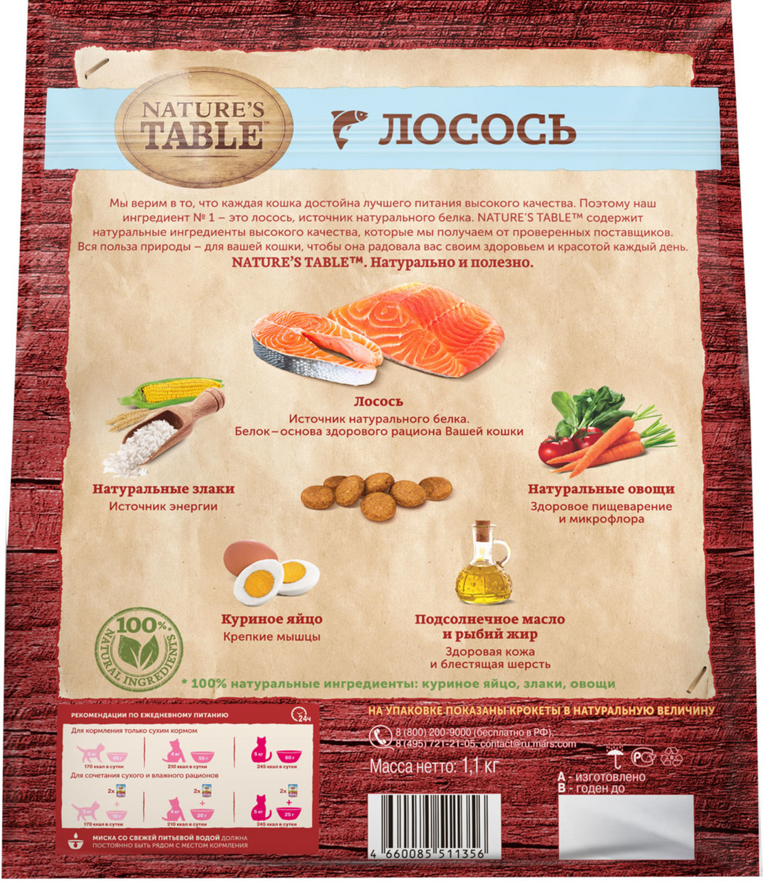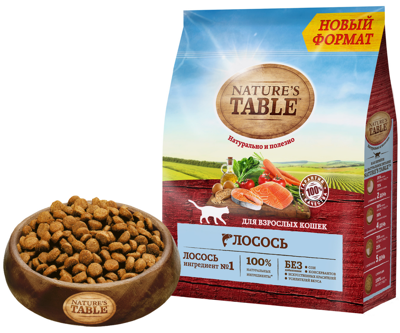 Nature’s Table натурально и полезно! Рацион Nature’s Table Лосось содержит 100% натуральные ингредиенты высокого качества, получаемые от проверенных поставщиков. Вся польза природы для вашей кошки, чтобы она радовала вас здоровьем и красотой день за днем!