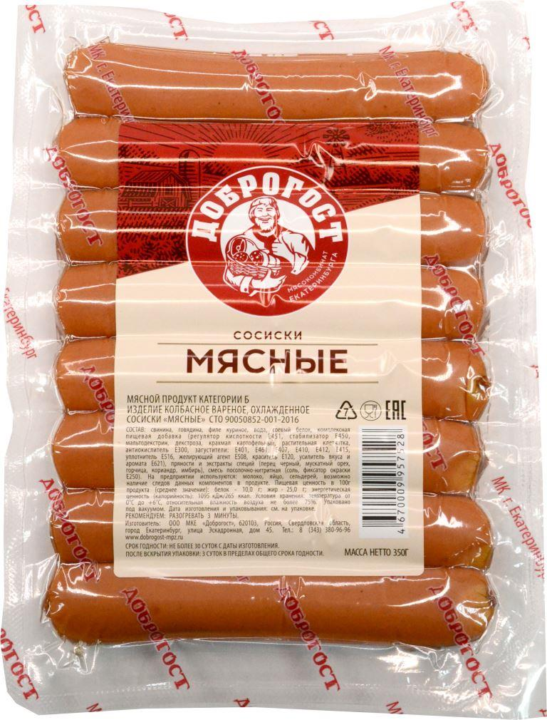 Сосиски мясные Доброгост, 350г – мясной продукт, приготовленный по классической рецептуре. Нежные, сочные сосиски с приятным сливочным вкусом и нежным ароматом пряностей. Плотная, однородная текстура без прожилок и хрящей позволяет аккуратно порезать сосиски на ровные куски. Продукт не разваривается, остается в первоначальной форме. Сосиски можно употреблять, как самостоятельное блюдо. Также они прекрасно сочетаются с картофельным пюре, макаронами, овощами и любой кашей. Их можно пожарить с яичницей – это будет прекрасный питательный завтрак, который зарядит энергией на целый день. Сосиски в тесте – прекрасный и быстрый перекус, выручат в дальней дороге и быстро утолят голод. Сосиски, пожаренные на мангале, с хрустящим хлебом и овощами, избавят вас от долгого приготовления пищи. Это вкусно, аппетитно, а главное – быстро и удобно.