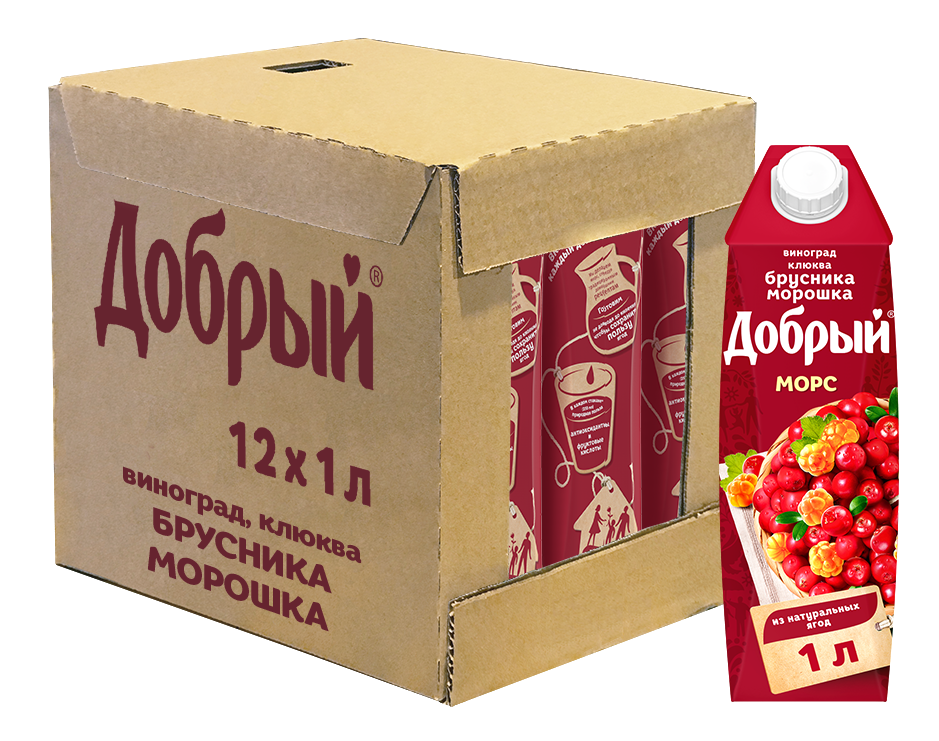 Добрый морс Виноград-клюква-брусника-морошка без добавления консервантов и красителей в удобной упаковке для семейного обеда или ужина.
