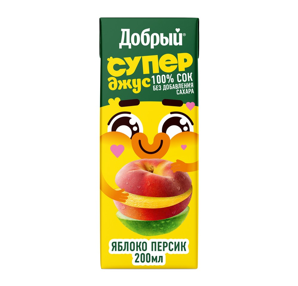 Добрый 100% сок Яблоко-Персик с витаминным комплексом Active Kid (B2, B3, B5, B12)без добавления сахара, консервантов и красителей в удобной упаковке 200 мл с трубочкой для питания ребенка раннего возраста. Обладает натуральным, сбалансированным вкусом, а витаминный комплекс Active Kid дает ребенку энергию для развития, Упаковка продукта может быть в цветном или белом виде.