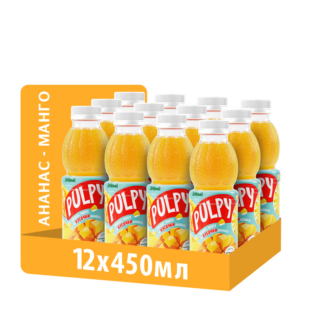 Встряхни Pulpy Ананас-Манго и открой для себя удивительное сочетание натуральных кусочков ананаса, сока фруктов и артезианской воды. - Натуральные ингредиенты.- 11% сока.- Без добавления консервантов и искусственных красителей.- Удобная бутылка дает тебе возможность насладиться ярким вкусом напитка, когда тебе так необходим перерыв! - Перерабатываемая упаковка.Pulpy - это напиток с соком и кусочками ананаса, который подарит яркий вкус и наполнит позитивными эмоциями. Скажи рутине нет - включай настроение с Pulpy!