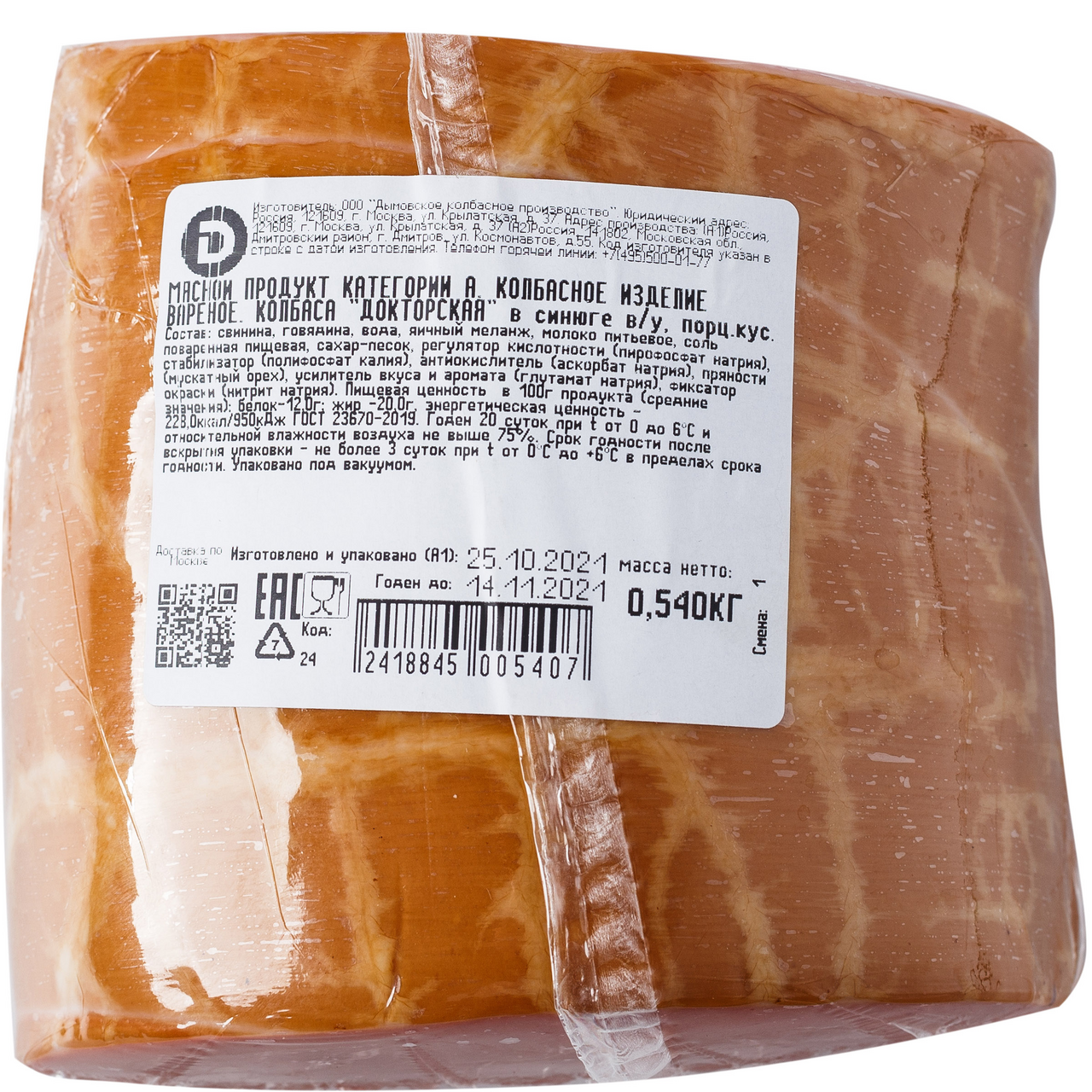 Колбаса вареная Докторская ДЫМОВ – это мясной продукт высшего сорта. Если разрезать палочку, вы увидите однородную и эластичную текстуру. На вкус колбаса очень нежная, в ней прослеживаются нотки мускатного ореха. Упаковывается в полиамидную оболочку, которая прекрасно сохраняет вкус и аромат изделия. Продукт создается на основе натуральных ингредиентов, в нем нет сои или другого растительного белка, а также ГМО, поэтому можно с уверенностью сказать о пищевой ценности и питательности. Вареную докторскую колбасу приобретайте в METRO на выгодных условиях. Доставка, удобная система оплаты. Состав : свинина, говядина, вода, соль пищевая, молоко сухое, загустители (гуаровая камедь), животный белок, регуляторы кислотности (фосфаты пищевые), антиоки��литель (изоаскорбат натрия), усилитель вкуса и аромата (глютамат натрия), сахар, натуральный краситель (кармин), фиксатор окраски (нитрит натрия). Пищевая ценность на 100 г продукта: белок - 10г, жир - 25г, углеводы - 2г. Энергетическая ценность 273 ккал. Хранить при Т - от 0'C до +6'C. Срок годности 20 суток. ТУ 9213-020-57088488-06.